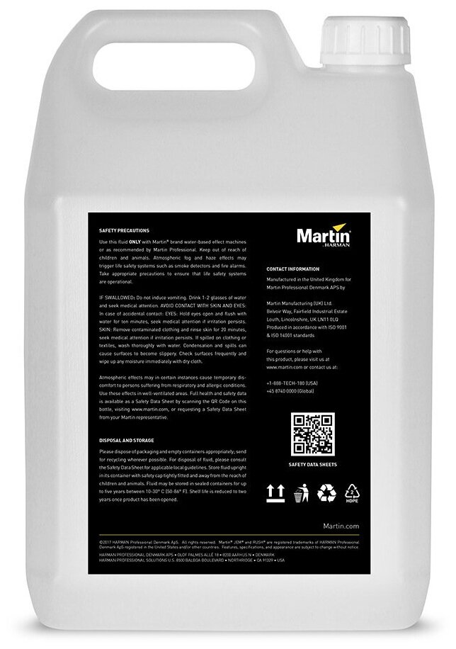 Martin Rush & Thrill Haze Fluid 5l – жидкость, предназначенная для создания эффекта тумана. Сделанная на водной основе, жидкость позволяет получить оптически прозрачную дымку. Индекс рефракции варьируется от низкого до среднего, период рассеивания – длительный. Rush & Thrill Haze Fluid 5l рекомендуется для различных моделей генераторов тумана. Страна производства: соединенное королевство. Над уникальными формулами жидкости для генератора тумана мы трудились вместе с ведущими режиссерами, дизайнерами и продюсерами, чтобы получить идеальный эффект. Не забивает сопло дымгенератора, защищает от отложений внутри нагревательного элемента, продлевает срок службы насоса генератора. Состав безвреден для человеческого организма. Меры предосторожности: не пить, при попадании в глаза промыть обильным количеством воды, при необходимости обратиться ко врачу.