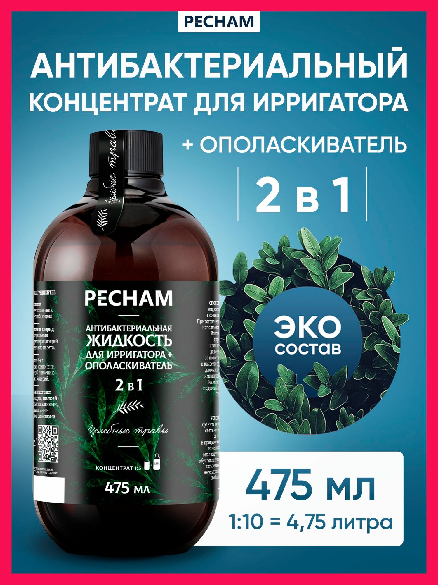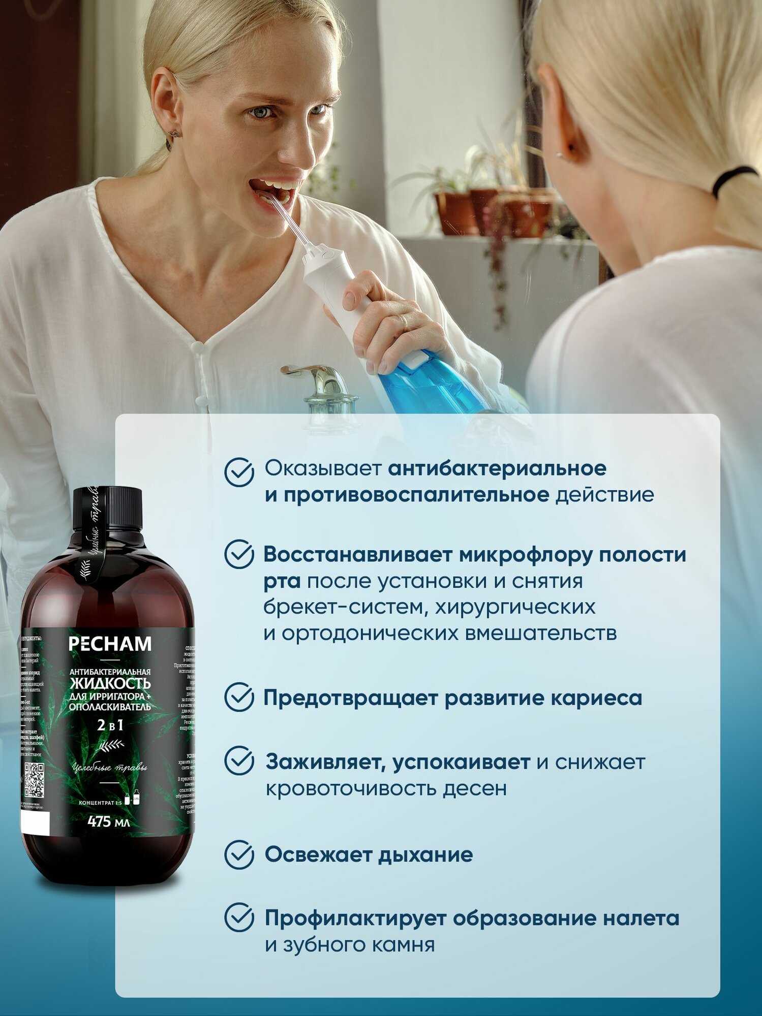Антибактериальная жидкость для ирригатора PECHAM для полости рта и десен. Это раствор-концентрат, который обеспечивает комплексный уход за полостью рта и деснами, не содержащий фтора и хлоргексидина.