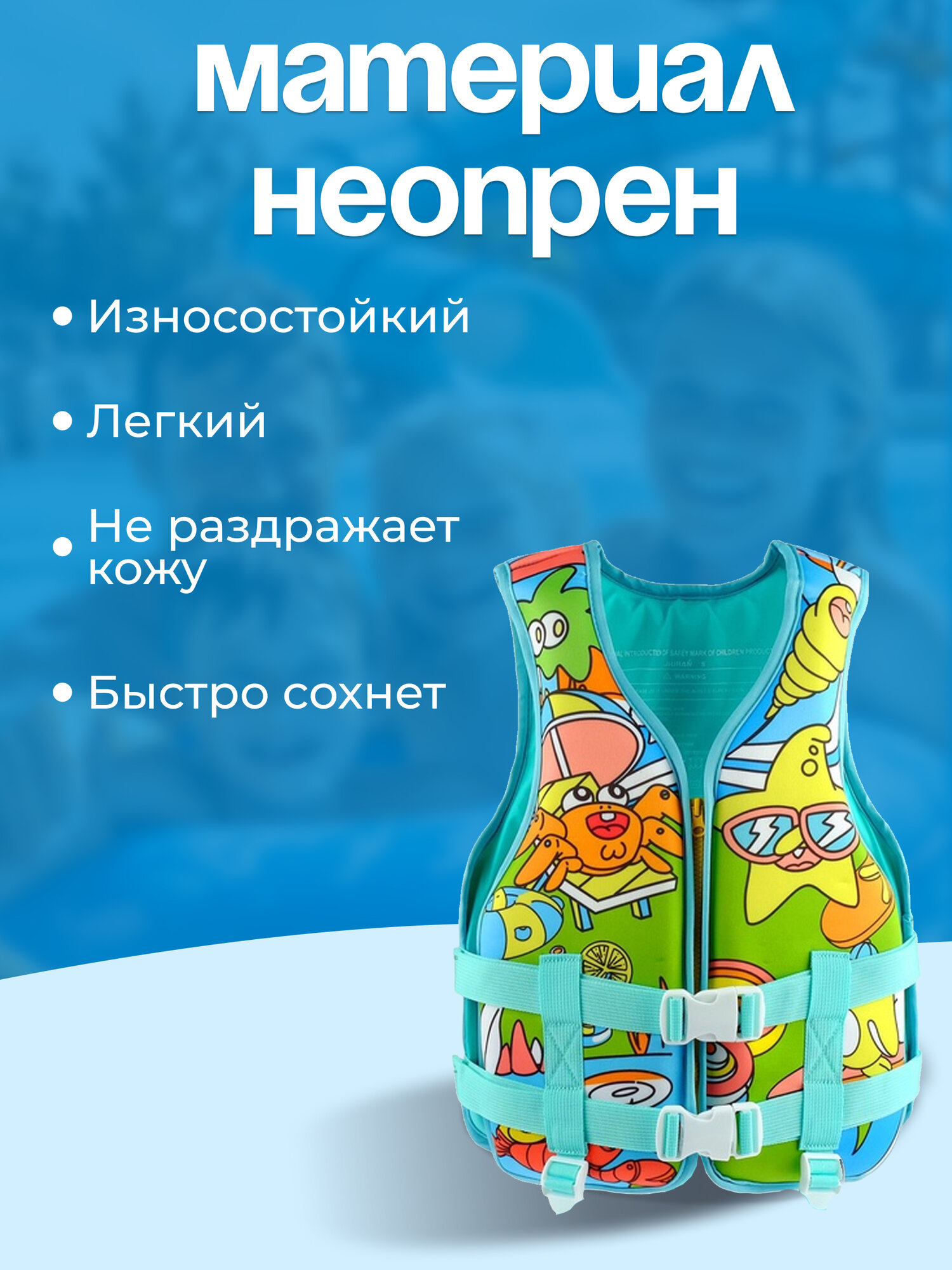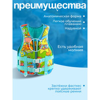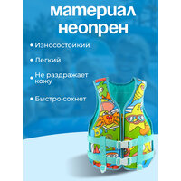 Жилет с поролоновыми вставками предназначен для обучения детей плаванию. Изделие имеет яркую расцветку, которая делает его заметным в воде. Жилет застёгивается на молнию и фиксируется регулируемыми ремешками.