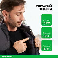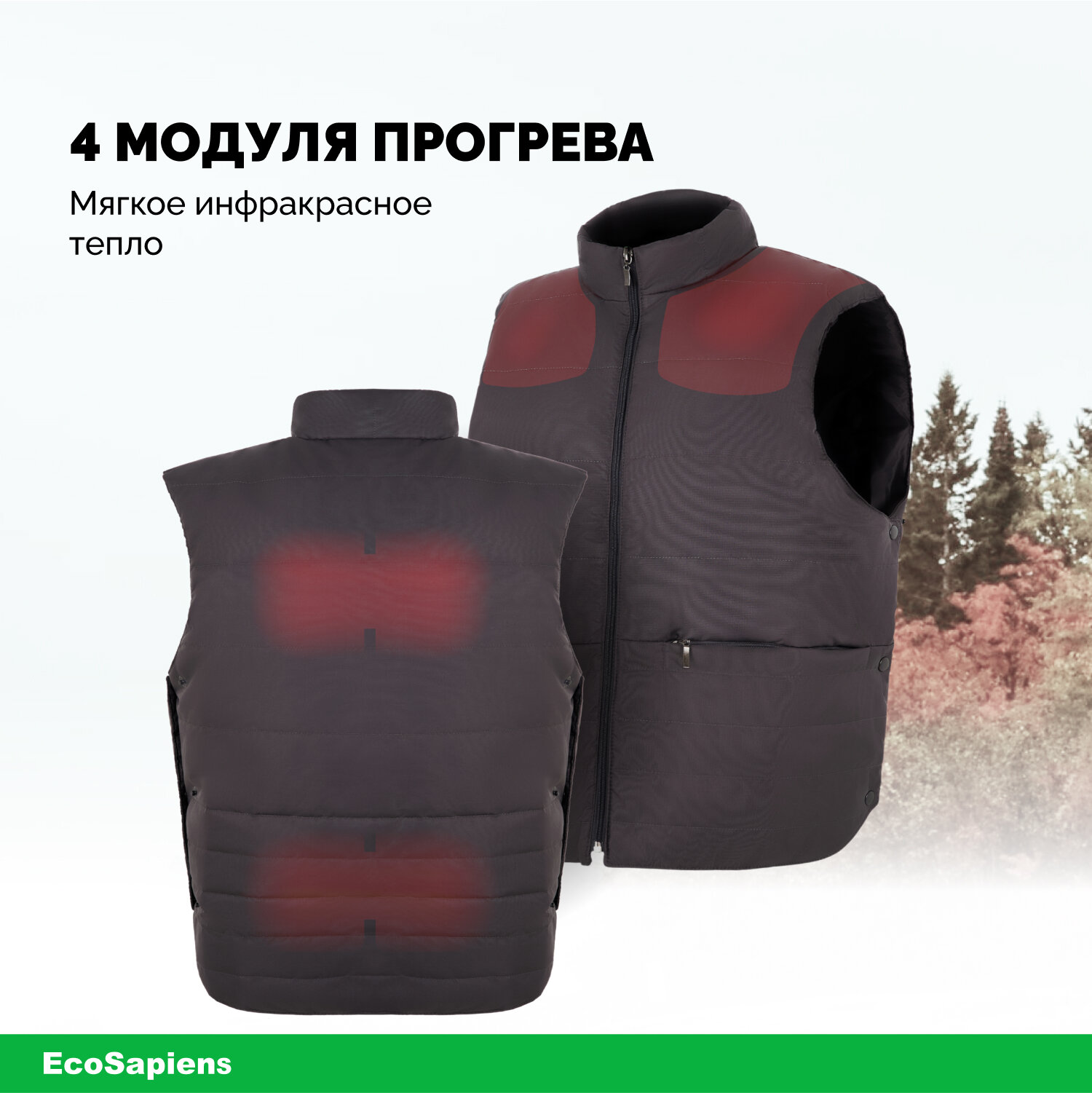 Жилет оснащен четырьмя модулями подогрева, расположенными в области плеч и спины и пояснице, что обеспечивает равномерное комфортное тепло по всему корпусу.
