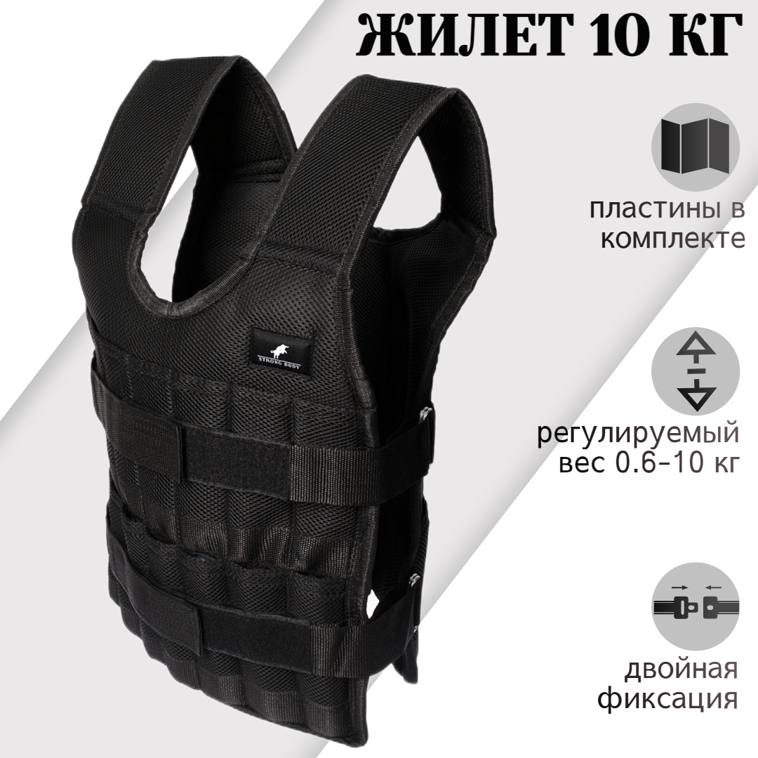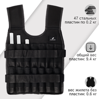 Жилет для тренировок с грузом STRONG BODY сделан из высокопрочного нейлона, синтетической ткани и стальных пластин. Жилет спортивный для бега весит 10 кг с учетом стальных грузов. Его длина составляет 60 см, ширина - 40 см. Жилет с утяжелителями 10 кг закрепляется на корпусе с помощью двойных фиксирующих ремней на липучке, расположенных в верхней и нижней части (один ремень крепится на липучку жилета, второй ремень крепится сверху на липучку первого ремня). Жилет с грузами удобно фиксировать и регулировать за счет длины липучек на фиксирующих ремнях. Он включает в себя 47 стальных металлических пластин. Общий вес без утяжелителей: 0,6 кг. Вес одной стальной пластины: 0,2 кг. Таким образом, вес регулируется от 0,6 кг до 10 кг, так как общий вес плит составляет 9,4 кг (47 пластин по 0,2 кг). Жилет утяжелитель с грузом имеет 28 карманов с липучками под пластины. Карманы расположены в два ряда, верхний ряд и нижний ряд, по 7 карманов в ряду, по 14 карманов с каждой стороны. Итого, общее количество карманов под пластины: 28. В один карман помещается от 1 до 3 пластин, что позволяет равномерно их распределить, либо установить на свое усмотрение. Беговой жилет утяжелительный используется для увеличения нагрузки во время тренировок, применяется для спорта как бронежилет для бега на средние и длинные дистанции, для резких ускорений на короткие дистанции, челнок, бег в гору или по лестнице. Беговой жилет позволяет более эффективно выполнять плиометрические прыжковые упражнения, а так же увеличивать нагрузку в упражнениях со своим весом. Его используют для подтягиваний, отжиманий от пола и на брусьях, для приседаний в кросс-тренинг и воркаут (workout). Данная модель подойдет для разного возраста и пола: для мужчин и женщин, для подростков и девушек. Наиболее распространенный жилет для бега мужской с грузами имеет вес 10 кг, 20 кг и 25 кг.