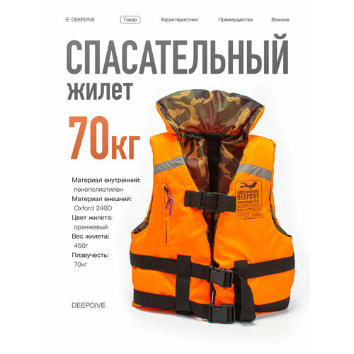 Жилет спасательный (страховочный) двусторонний DeepDive с воротником. Позволяет поддерживать человека на плаву долгое время. Плавающий воротник-стойка для поддержания головы. Накладной карман на замке. Боковые стяжки и паховые ремни для подгона жилета по фигуре. Свисток для вызова спасателей. Светоотражающие элементы (для обнаружения в темноте). Вес: до 70 кг. Тип жилета: двусторонний Цвет: Оранжевый/КМФ Материал: Вспененный материал, ткань Страна: Беларусь