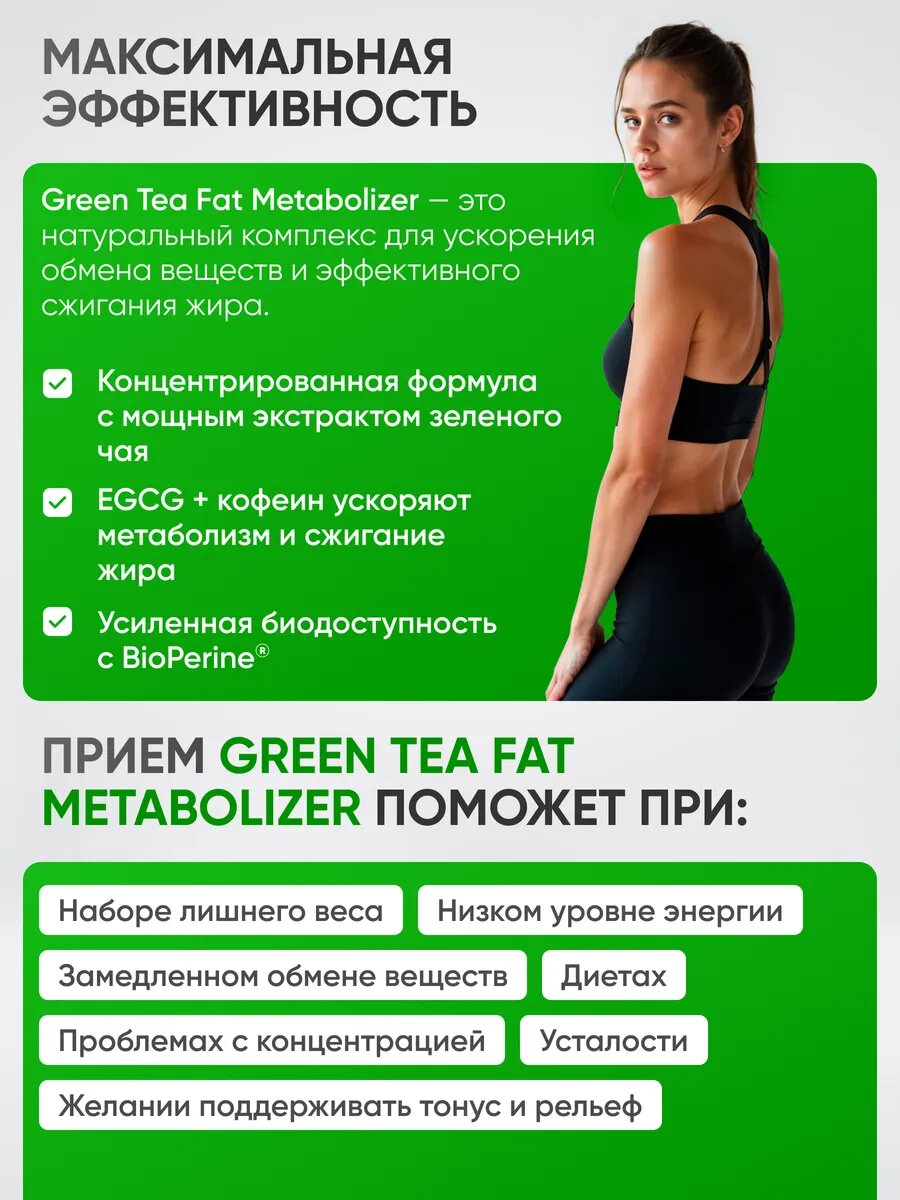 Этот метаболайзер жиров на основе зеленого чая помогает активизировать процессы сжигания калорий и поддержания обмена веществ. Сочетание экстракта зеленого чая, кофеина и других целевых питательных веществ способствует улучшению обмена веществ, стимулирует теплообразование и поддерживает потерю жира.