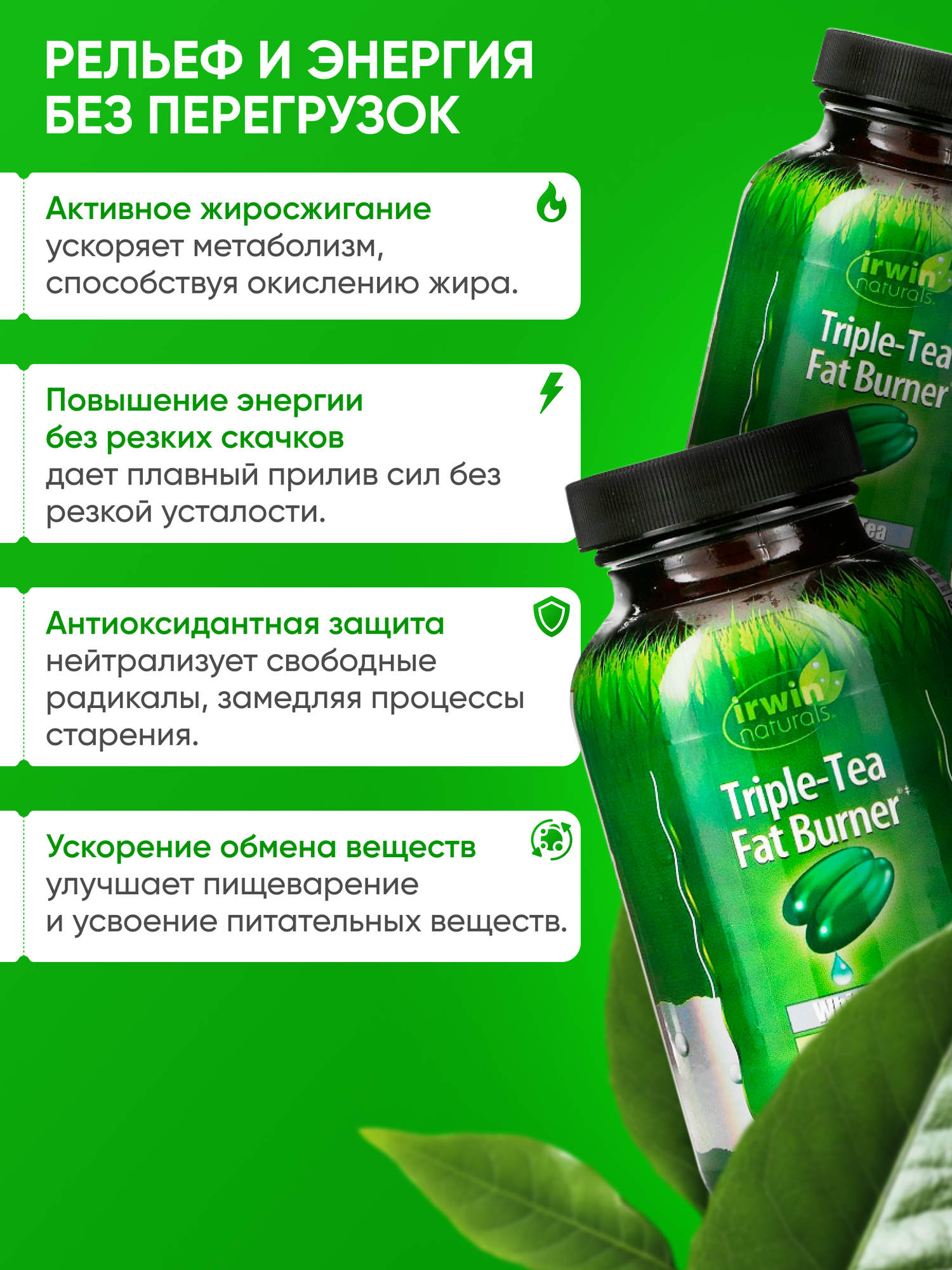 Жиросжигатель Тройной Чай — это мощное средство для поддержки потери веса, которое сочетает в себе экстракты белого, зеленого и черного чая. Эти три вида чая действуют синергетически, обеспечивая эффективное теплообразование, увеличение расхода энергии и мощную антиоксидантную защиту. При соблюдении здорового питания и физической активности, Triple-Tea Fat Burner помогает достичь желаемых результатов.