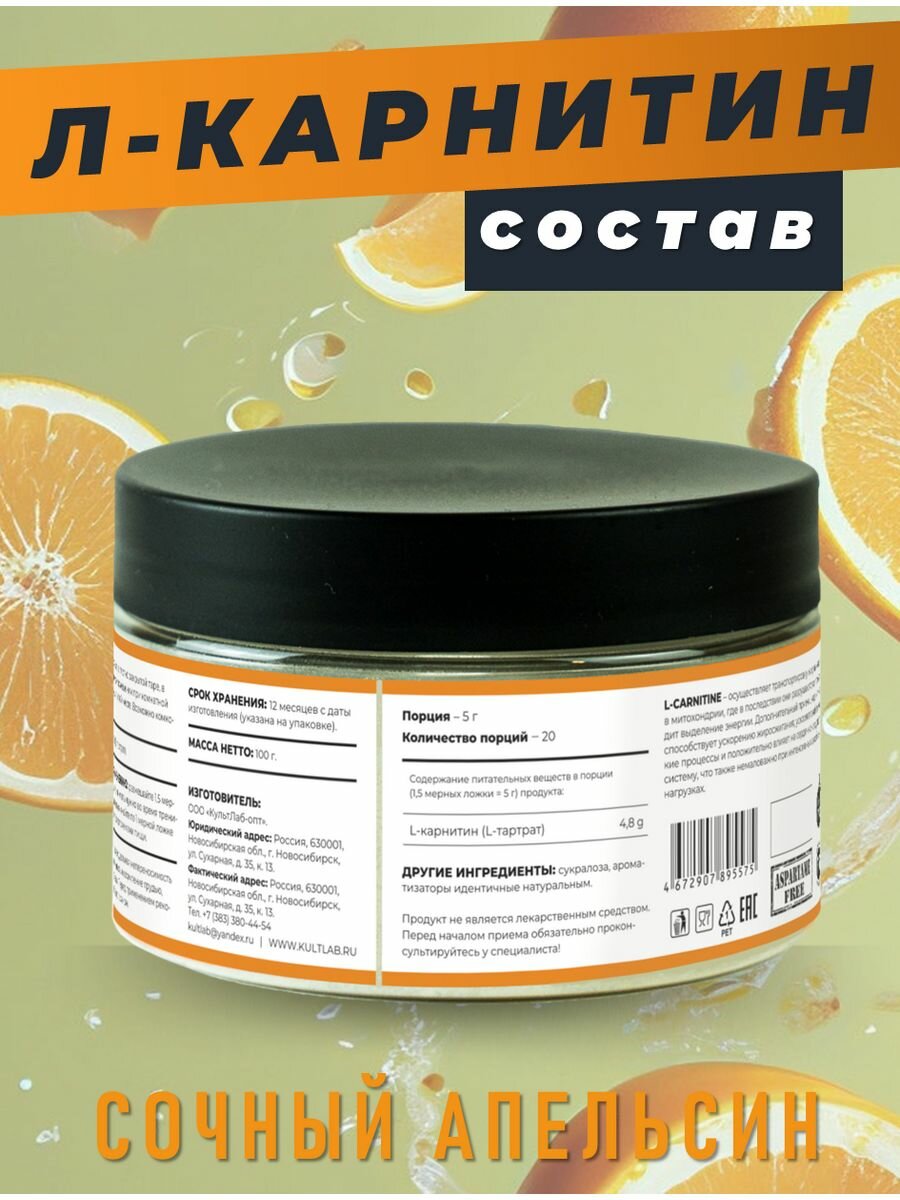 Жиросжигатель «KultLab L-carnitine», Л-карнитин со вкусом Апельсин, 100 грамм: сравнение цен, характеристики, фото, актуальное наличие и цены.
