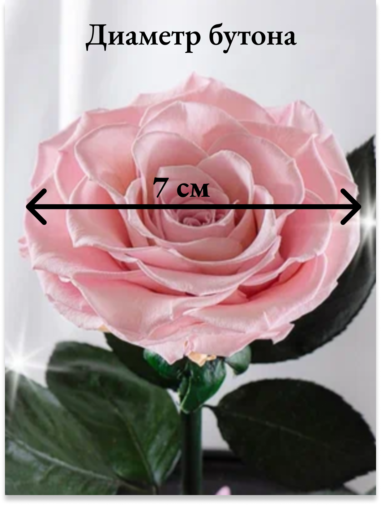 - размер розы (высота*диаметр*бутон): 27*15*6-7 см (самый популярный и доступный размер); - стекло 1 категории - срок хранения: 5 лет. - гарантия качества! - ручная сборка: все сделано нашими флористами. Собственное производство.