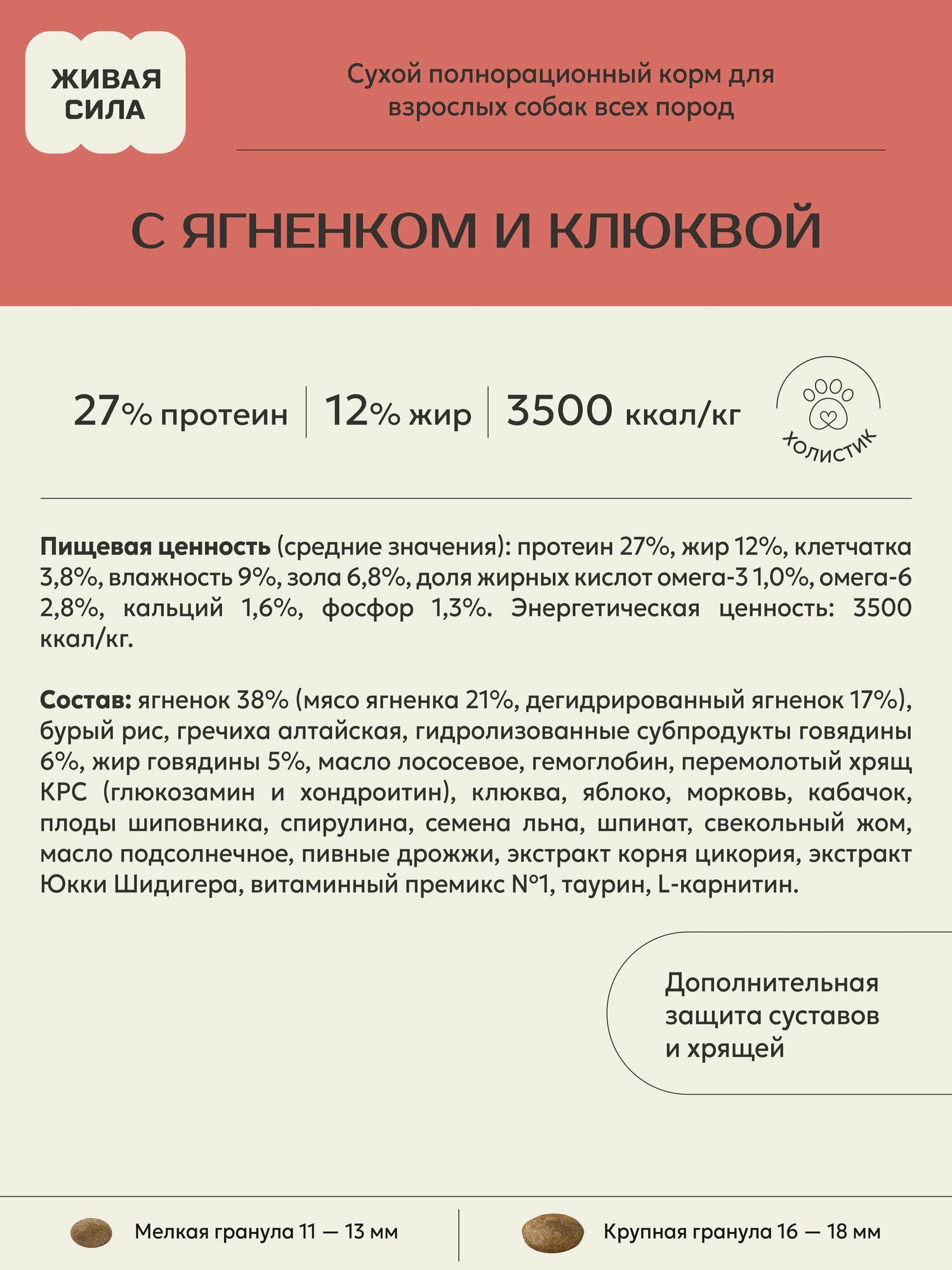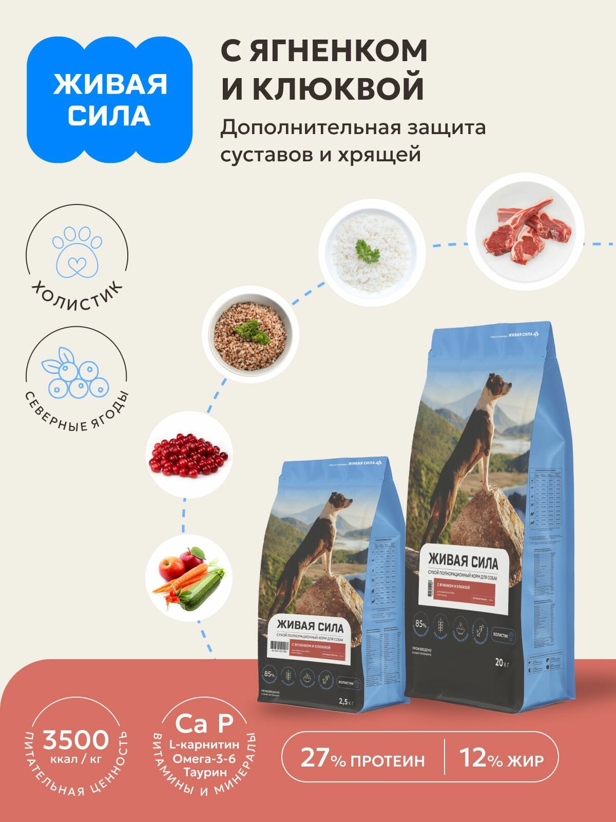 Купить Живая Сила сухой полнорационный корм с ягненком и клюквой для взрослых собак крупных и средних пород, крупная гранула, 2,5кг с доставкой по всей России. Живая Сила сухой полнорационный корм с ягненком и клюквой для взрослых собак крупных и средних пород, крупная гранула, 2,5кг: сравнение цен, характеристики, фото, актуальное наличие и цены.