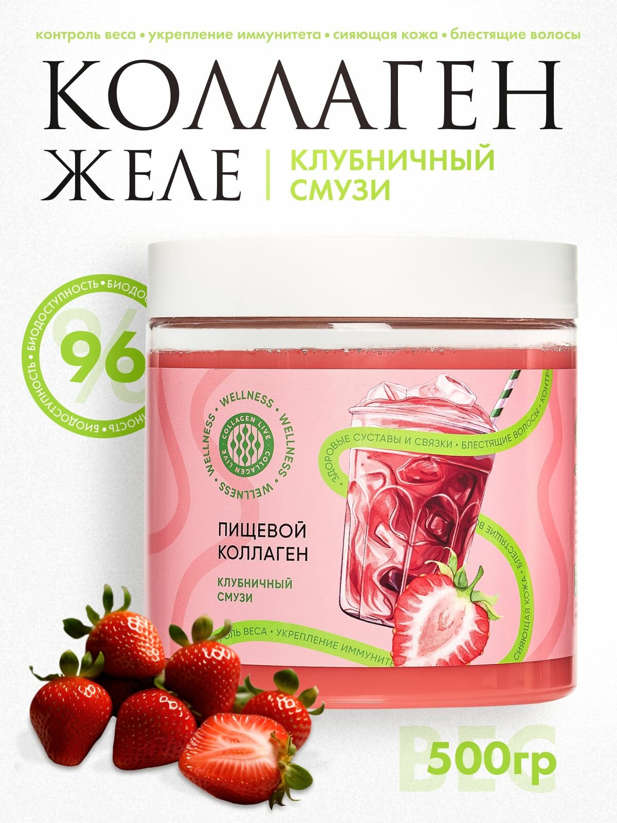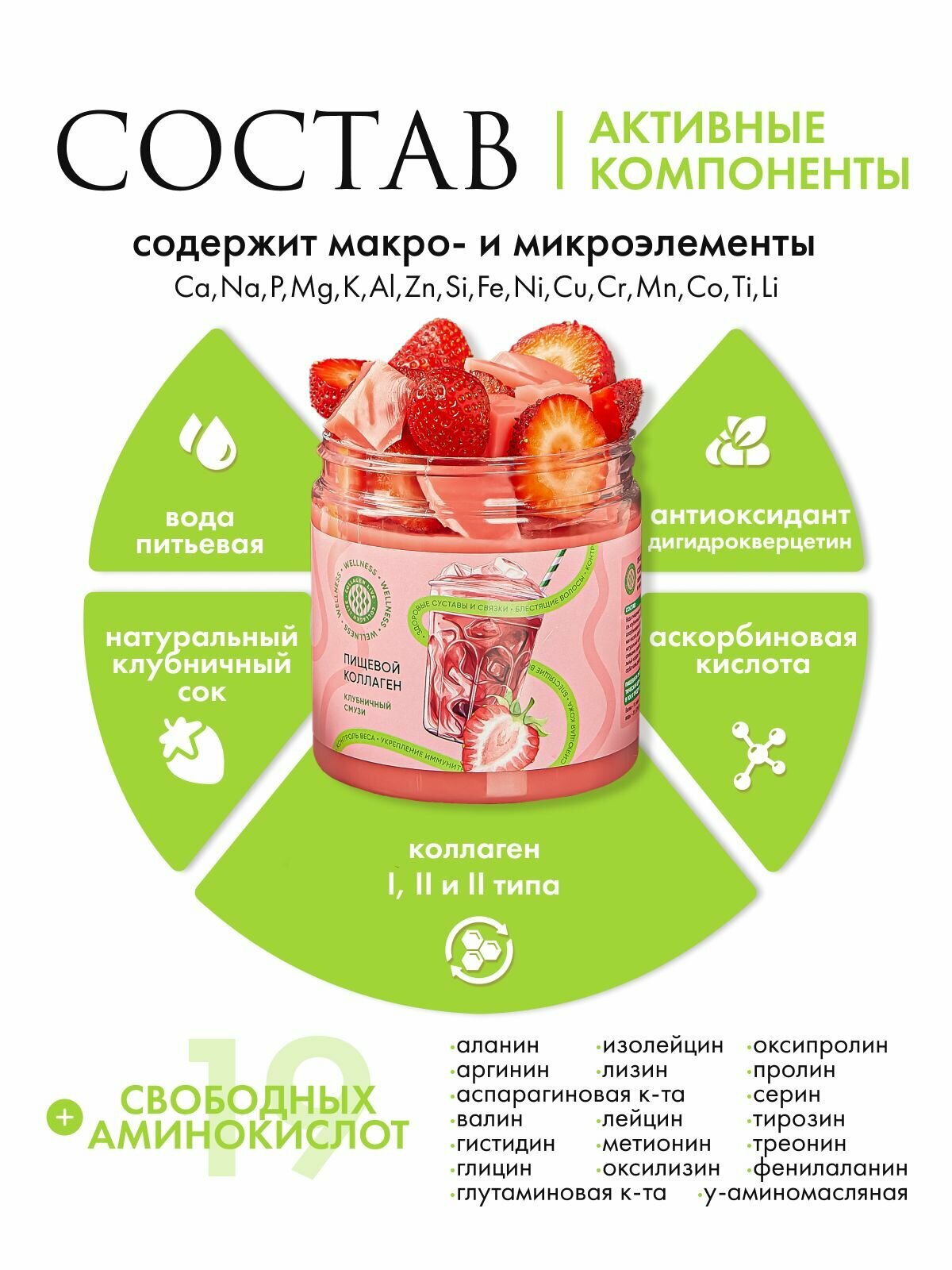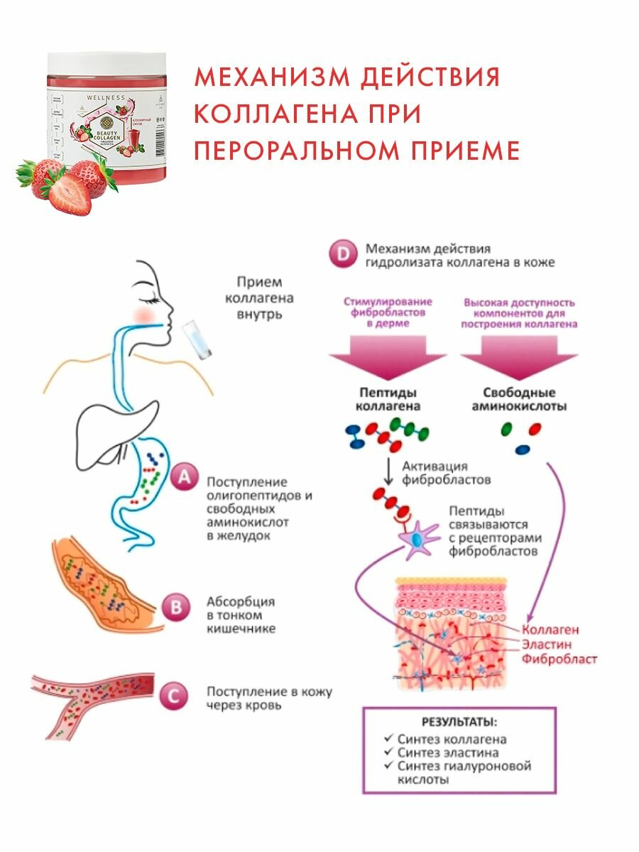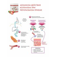 Натуральный коллаген без ГМО. Пищевой коллаген с витамином C в форме желе — это не только эффективное средство улучшение состояния кожи, волос, зубов, десен и ногтей, но и важный компонент для поддержания здоровья суставов и связок. Коллаген для кожи, молодости и здоровья – Collagen Live хорошо усваивается организмом, уменьшает выпадение волос, усиливает рост ногтей и является непосредственным укрепителем для ногтей. Коллаген способствует выработке собственного коллагена, тем самым увеличивается рост волос и уменьшается выпадение и ломкость. Благодаря естественной формуле живого коллагена, он обладает уникальными свойствами, способствующими улучшению работы ЖКТ. Уникальная комбинация коллагена 1, 2 и 3 типа позволяет достичь максимального эффекта при использовании продукта. COLLAGEN LIVE - это живой пищевой коллаген, который совмещает в себе витамины и спортивное питание, таким образом, ускоряется регенерация тканей после тренировок, уменьшается риск травм, повышается выносливость и сила мышц, ускоряется похудение. Коллаген для суставов содержит аминкислоты, и отлично подходит для людей, которые ведут активный образ жизни и спортсменов. Спортивный коллаген способствует укреплению мышц, что помогает ускорить процесс сжигания жира и формирования рельефного тела. Коллаген-желе в отдельных саше удобно брать с собой, в отличие от сухого коллаген в порошке, который нужно разводить водой. Кроме того, этот продукт также способствует замедлению процессов старения. Также коллаген желе придаёт коже упругость и увлажнение. В отличие от коллагена порошка, животный коллаген производится по щадящей технологии Multiferment DDL из сертифицированного куриного сырья: сырье не нагревается до высоких температур, молекулы коллагена не разрушаются, в результате чего коллаген сохраняет максимум полезных свойств и лучше усваивается. В частности, в линейке «Вкусное путешествие» используются гребни петуха, коллаген из этого сырья самый комплементарный человеческому коллагену, как следствие - степень усвояемости продукта 96%. Снижение выработки коллагена может увеличить риск таких заболеваний как: остеохондроз позвоночника, нарушение биологических ритмов организма, а также нарушение сна. COLLAGEN LIVE WELLNESS содержит: 16 макро и микроэлементов от кальция и магния до железа и цинка, 19 аминокислот, которые нужны в том числе и для того, чтобы эффективно бороться со стрессом, тревожностью и расстройствами сна, витамин С, который помогает организму вырабатывать свой собственный коллаген и делает правильный коллаген Collagen Live еще эффективнее. Оптимальный курс приема коллагена - 3 месяца. После 35 лет, а также при наличии хронических заболеваний, прием пищевого коллагена может осуществляться на постоянной основе.