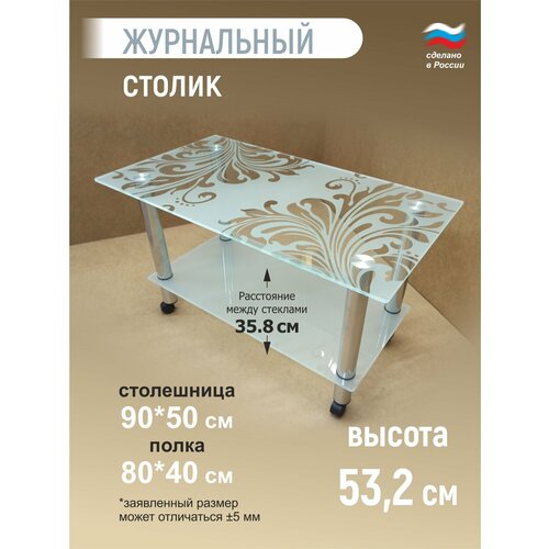 Все наши изделия поставляется в разобранном виде, т. к. столешница и полка из стекла требуют особой защиты при упаковке и перевозке. Мы тщательно следим за качеством упаковки наших столов и тумб, ведь нам очень важно, чтобы покупатель получил товар в идеальном виде! В каждую упаковку мы вкладываем подробную инструкцию, по которой вы легко соберете столик. Если же возникнут вопросы, сложности или даже поломка комплектующих, Вы всегда можете обратится к нам на контакты, указанные внизу инструкции. Уже много раз наши специалисты помогали клиентам по видеосвязи. Не торопитесь с плохим отзывом, мы всегда готовы решить проблему! Стильный журнальный столик изготовлен из высококачественного стекла и дополнен рисунком в технике художественная матировка. Напыление нанесено на нижнюю поверхность стекла, сверху оно гладкое. Столик будет отлично смотреться любом интерьере, а благодаря компактным размерам хорошо впишется даже в маленькую комнату. Стол можно разместить в гостиной для организации перекуса или полноценного обеда, в спальню как прикроватную тумбочку или даже в прихожую, использовать его как кофейный или приставной столик. Можно использовать как сервировочный столик в столовой, туалетный столик для косметики в спальню, стол для ноутбука, столик для сувениров или для цветов. Полочки можно использовать для хранения вещей, как маленький книжный шкаф или убрать туда самые нужные мелочи для дома. На нем можно работать за ноутбуком, можно разместить оргтехнику и коллекцию фарфоровых фигурок. Для удобства перемещения сделан на колесиках. Края столешницы тщательно обработаны, что делает ее абсолютно безопасной для Вашей семьи. Стол имеет высокую прочность и надежность, а также практичен в быту, т. к. не впитывает посторонние запахи, не деформируется от воздействия температуры, пара и влаги. Столешница из стекла сохраняет первоначальную красоту и форму множество лет. Структура материала не впитывает загрязнения, в отличие от изделий из дерева и ламината. Также стекло экологически безопасно и не выделяет вредных веществ. Однако все же существует риск разбить или поцарапать поверхность из стекла. На стеклянных элементах заметны следы от пальцев, пыль, поэтому придется часто их протирать. Некоторых людей раздражает холодность и неприятные звуки от контакта со столовыми приборами, пугают торцы и углы. Первый минус нейтрализуют сервировочные салфетки, а вторую проблему решат закругленные края всех наших столов и тумб. Если выбрать стол из стекла в матовом исполнении, то загрязнения будут не так заметны и визуально уменьшится ощущение холода. Вся продукция соответствует требованиям ТР ТС 025/2012 О безопасности мебельной продукции и имеет декларацию о соответствии. Мы регулярно обновляем наш каталог, а благодаря акциям Вы можете купить наши столы и тумбы со скидкой. Добавляйте наш бренд в избранное, чтобы не пропустить выгоду!