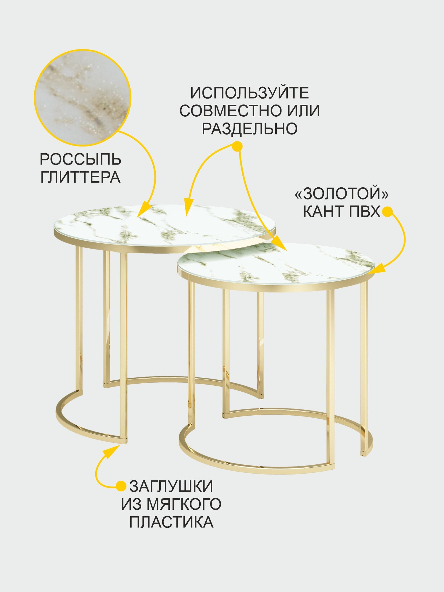 Оттенок столешницы комплекта журнальных столов включает в себя классические белые тона и изысканность мрамора. А в сочетании с золотыми опорами создает неповторимый образ.