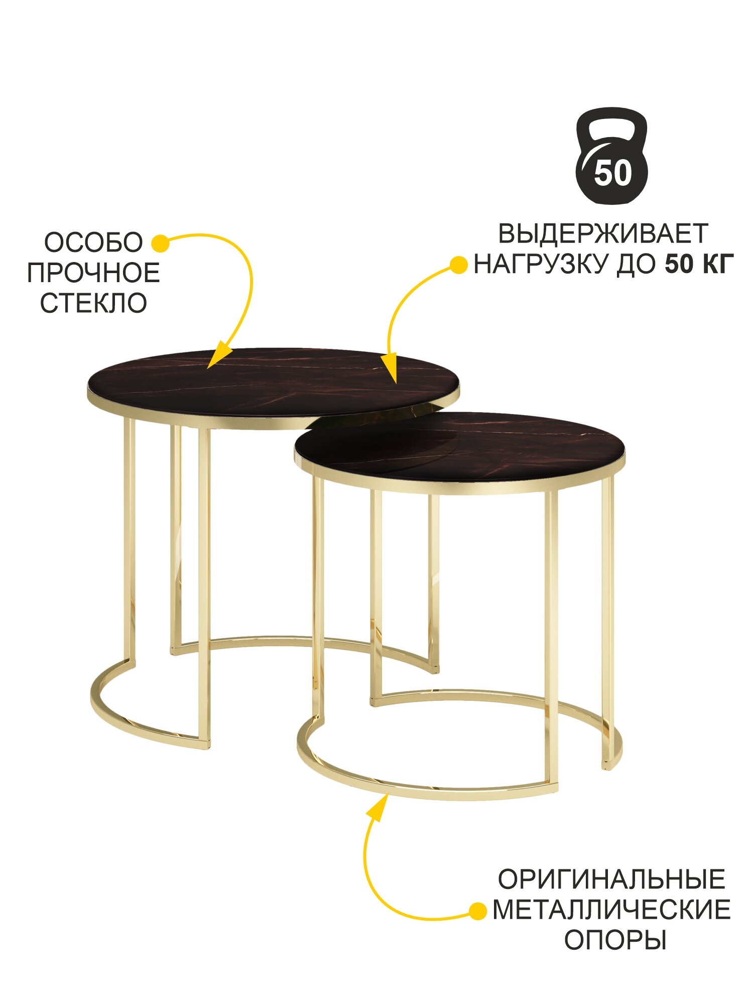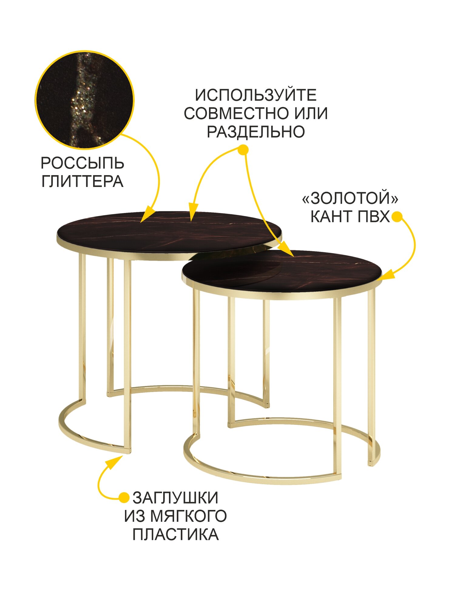 Эффектное сочетание столешницы под темный камень и глянцевых золотых опор придает комплекту журнальных столиков неповторимый образ, который будет ярким акцентом в интерьере.