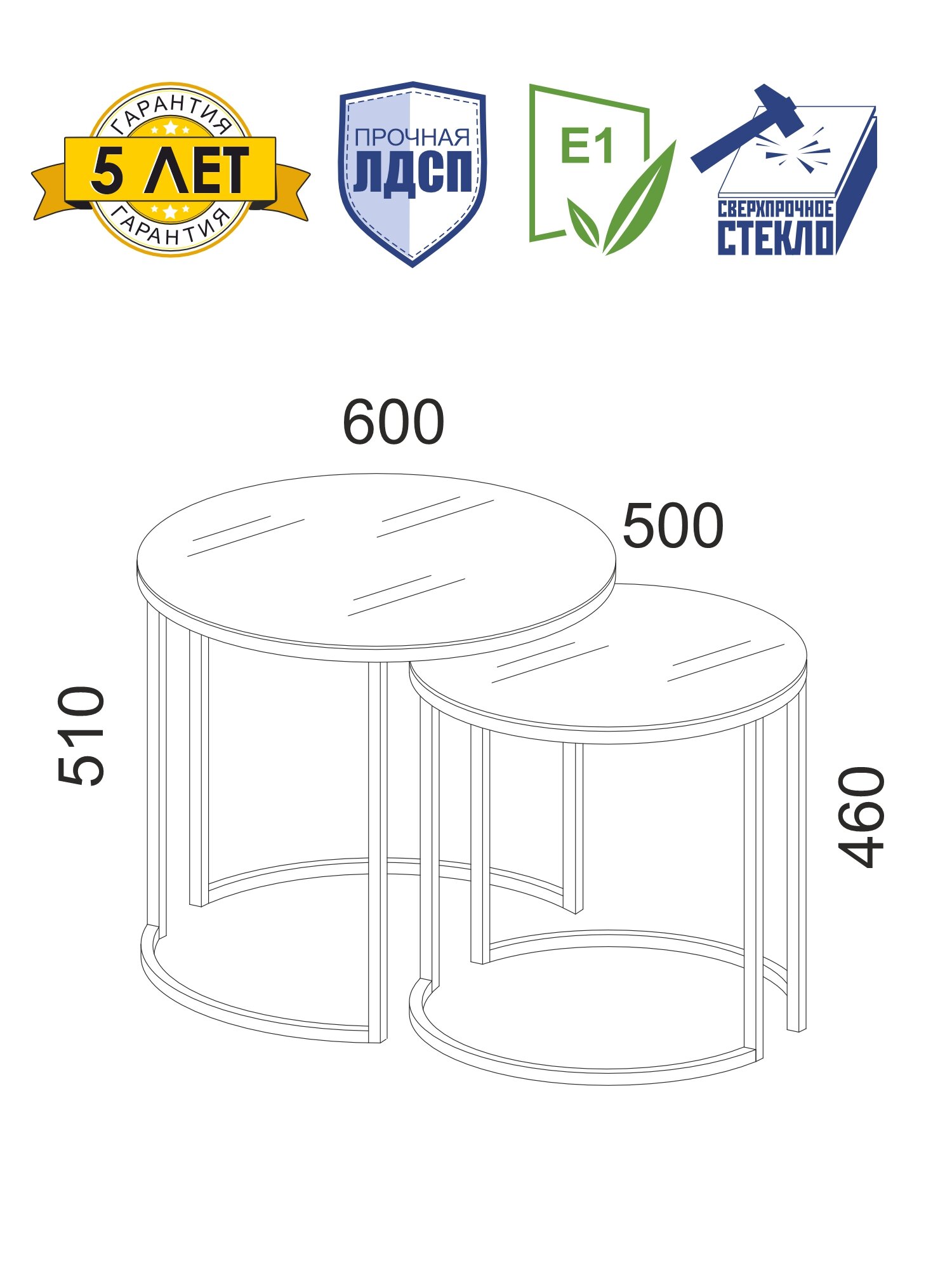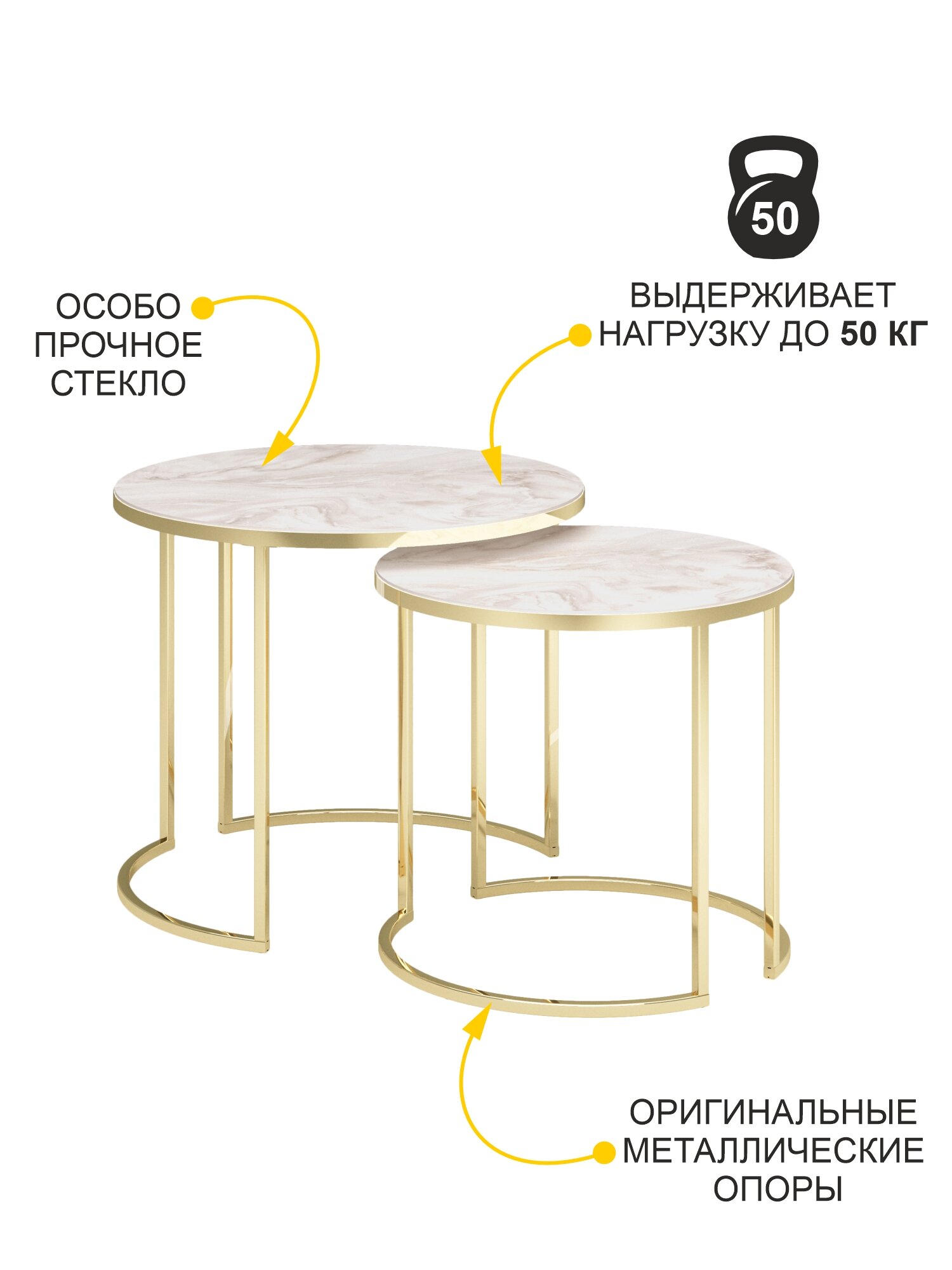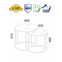 • Оригинальный комплект из двух журнальных столиков можно комбинировать по-разному, создавая интересные интерьерные решения. Столики 50 см и 60 см идеально дополняют друг друга, при этом каждый может использоваться самостоятельно. Это отличный вариант для применения в качестве кофейного и журнального столиков, прикроватной тумбы или изящного предмета декора. За одну цену Вы получаете два стола.