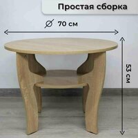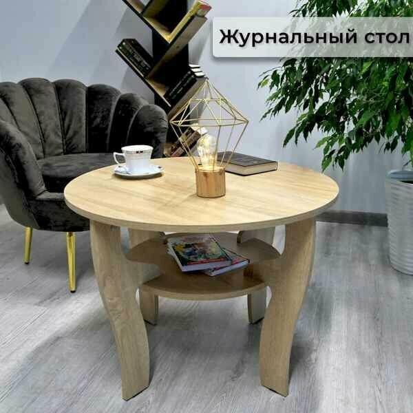 Миниатюрный журнальный столик – модель для гостиных традиционного классического дизайна. Круглую столешницу поддерживают четыре опоры , невысоко над полом укреплена дополнительная полка меньшего диаметра для книг, журналов, рукоделия. При изготовлении столика использованы только древесные материалы: ЛДСП. Столик стационарный, но небольшие размеры и вес позволяют без труда приставлять его к дивану или креслу.