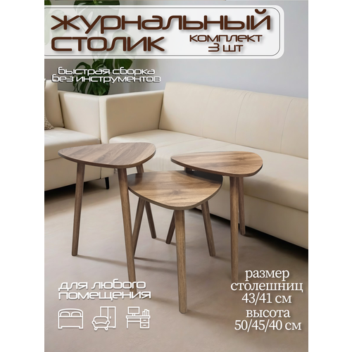 Современный эстетичный комплект из трёх деревянных столиков. Набор из 3 штук: габариты 43х41х49,5 см, 43х41х44,5 см и 40х43х40 см. Столик журнальный кофейный прикроватный - это идеальное решение для создания уютной атмосферы в гостиной комнате, спальне, детской, прихожей, в офисе и на лоджии. Журнальный столик служит подставкой для книг, журнала, чашки чая или кофе и идеально впишется в любой стиль интерьера: от скандинавского до лофта. Удобная и практичная форма столика позволит Вам наслаждаться завтраком или чашечкой кофе в комфорте и уютной атмосфере. Компактные размеры столика позволяют легко перемещать его по комнате. Дизайнерский вид столика журнального обязательно привлечет внимание ваших гостей и подчеркнет ваш безупречный вкус. Его стильный и современный вид станет отличным дополнением к вашему интерьеру и добавит неповторимую атмосферу в ваш дом.