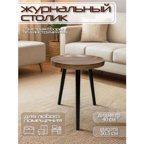 Стильный удобный компактный журнальный столик в цвете орех станет идеальным дополнением к вашему интерьеру. Диаметр столика 40 см, высота 50,5 см. Журнальный столик кофейный – это идеальное решение для создания уютной атмосферы в вашей гостиной, спальне, на кухне, прихожей, в детской комнате, на балконе или террасе. Он прекрасно впишется в любой стиль интерьера: от скандинавского до лофта. Выполнен из качественных материалов столик журнальный обладает прочной конструкцией и долгим сроком службы. Удобная и практичная круглая форма столика позволит Вам наслаждаться завтраком или чашечкой кофе в комфорте и уютной атмосфере. Компактные размеры столика позволяют легко перемещать его по комнате или использовать в качестве подставки для цветов или декоративных элементов. Дизайнерский вид столика журнального обязательно привлечет внимание ваших гостей и подчеркнет ваш безупречный вкус. Его стильный и современный вид станет отличным дополнением к вашему интерьеру и добавит неповторимую атмосферу в ваш дом.