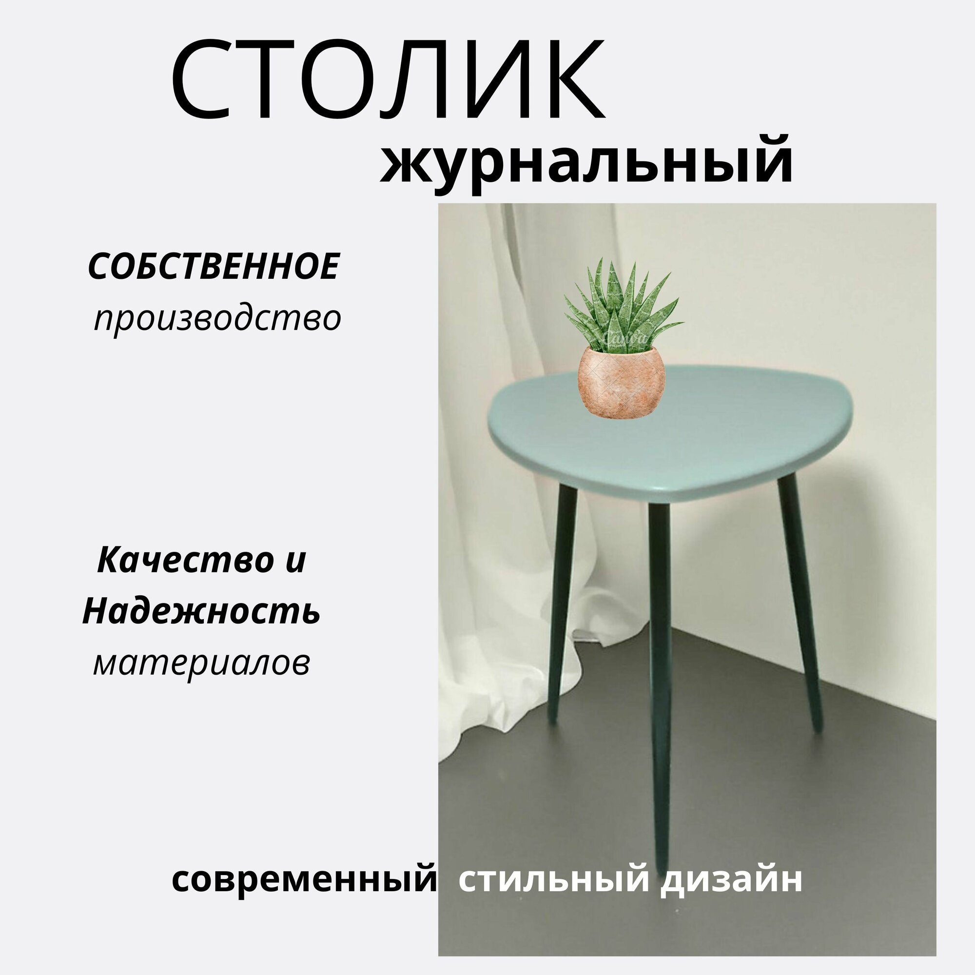 Журнальный столик, кофейный, прикроватный, треугольный . длина сторон 47х47х47см. Цвет: мятный на черных металлических ножках-конус.: сравнение цен, характеристики, фото, актуальное наличие и цены.
