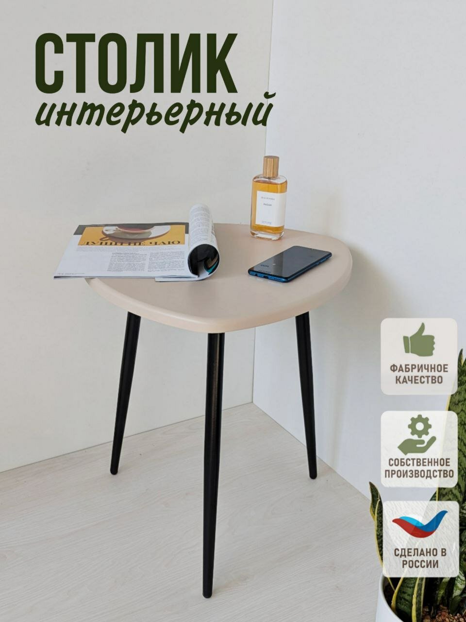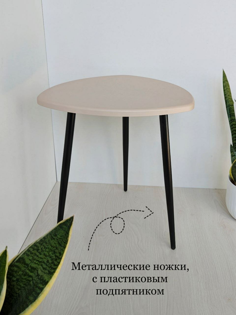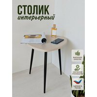 Купить Журнальный столик, кофейный, прикроватный, треугольный. длина сторон 47х47х47см. Цвет: светло-бежевый на черных металлических ножках-конус. с доставкой по всей России.