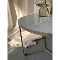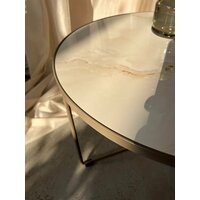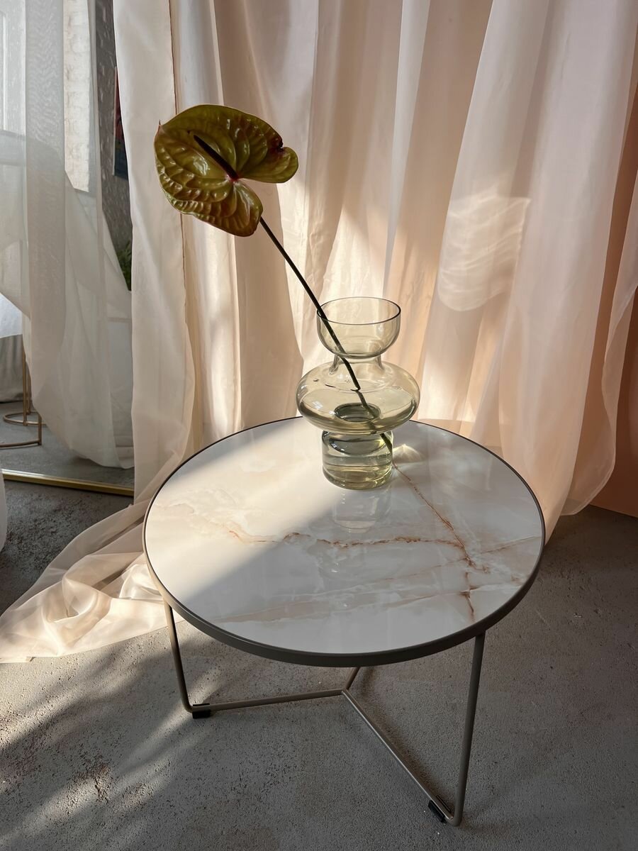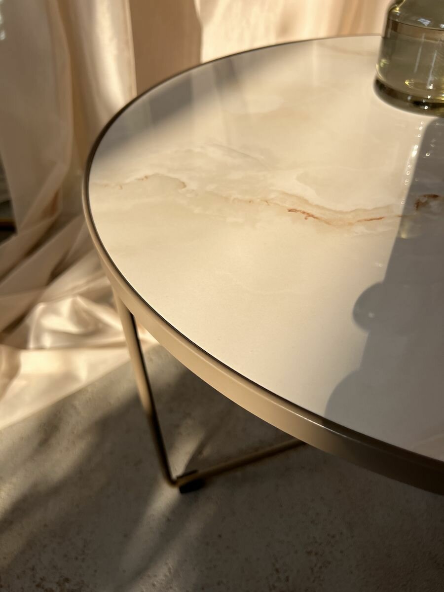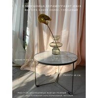 Размер столика: диаметр 60, высота 45. Стол журнальный прекрасно впишется в любой интерьер. Столики журнальные идеально подойдут в гостиную, спальню, кухню, офис, салон красоты и для дачи. Приставные журнальные столики выступают в роли дополнительной, полезной рабочей поверхности, а когда приходят гости, их можно использовать как фуршетный или кофейный столик, или в качестве классического сервировочного стола. Его легко расположить под большим кухонным столом. Столики журнальные можно использовать как стол письменный, прикроватный. Подойдут для работы за компьютером, как мини обеденный стол, приставной, сервировочный столик в столовой, туалетный столик для косметики, стол для ноутбука и телефона. Благодаря мобильности, столики легко комбинируются между собой и сочетаются с другими Столешница выполнена из керамогранита-качественного и очень прочного материала, рисунок которого повторяет фактуру мрамора. MARBLE- керамогранит под мрамор c Серым рисунком, матовый, без глянцевого блеска. Материал столешницы комплекта ONIX - керамогранит глянцевый, лёгкая текстура камня оникс. BLACK MARBLE - керамогранит черный с белыми прожилками, глянцевый. Устойчив к царапинам, пятнам.