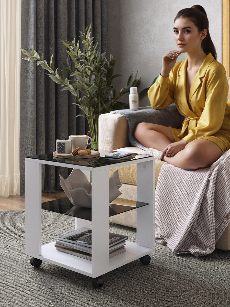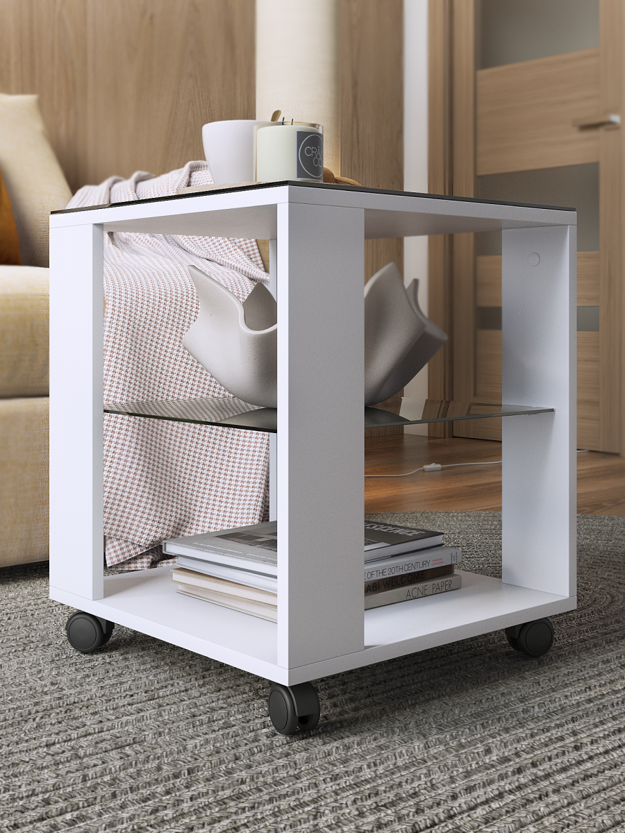 Журнальный столик на колесиках Акрона КУБ белый/стекло черное: сравнение цен, характеристики, фото, актуальное наличие и цены.