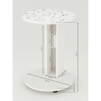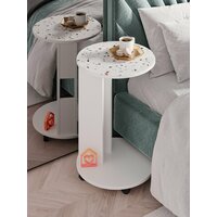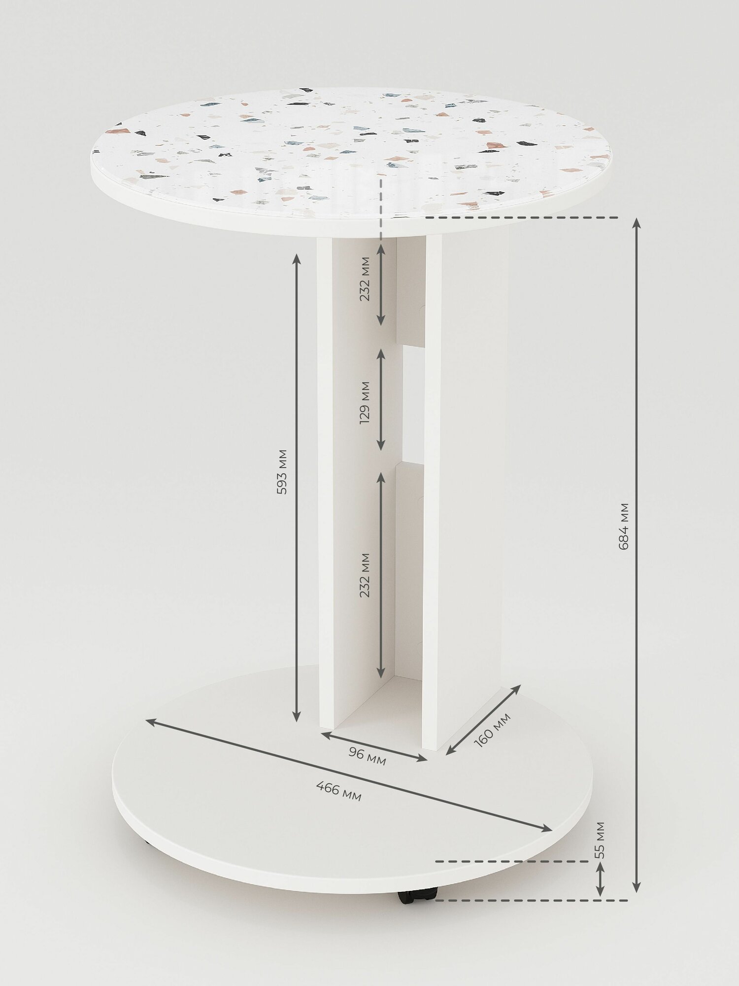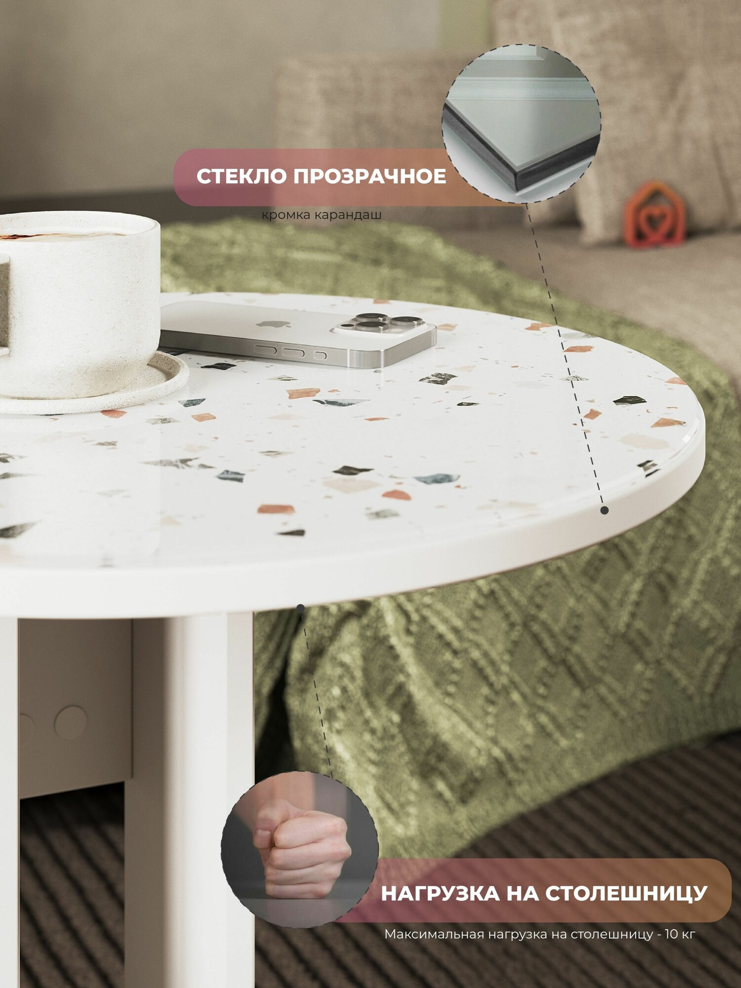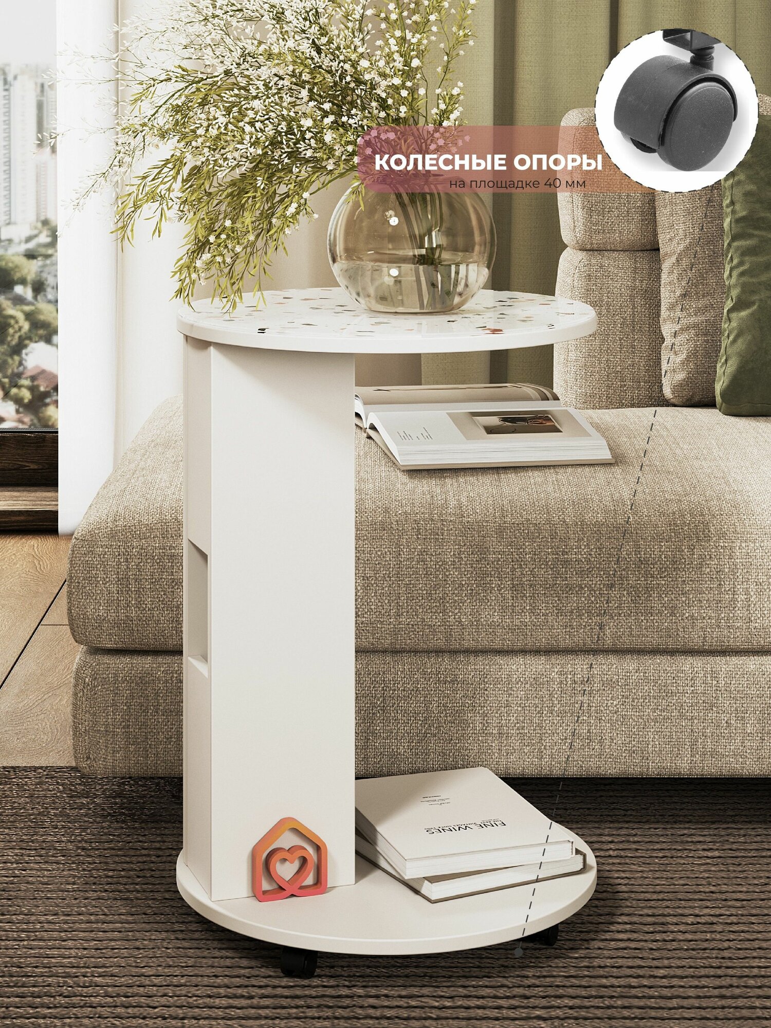 Круглый кофейный журнальный столик на колесиках с витражным стеклом под каменную поверхность отлично впишется в любой интерьер. Современная мебель обладает универсальным дизайном, что делает её эстетичным акцентом в гостиной, зале или спальне.