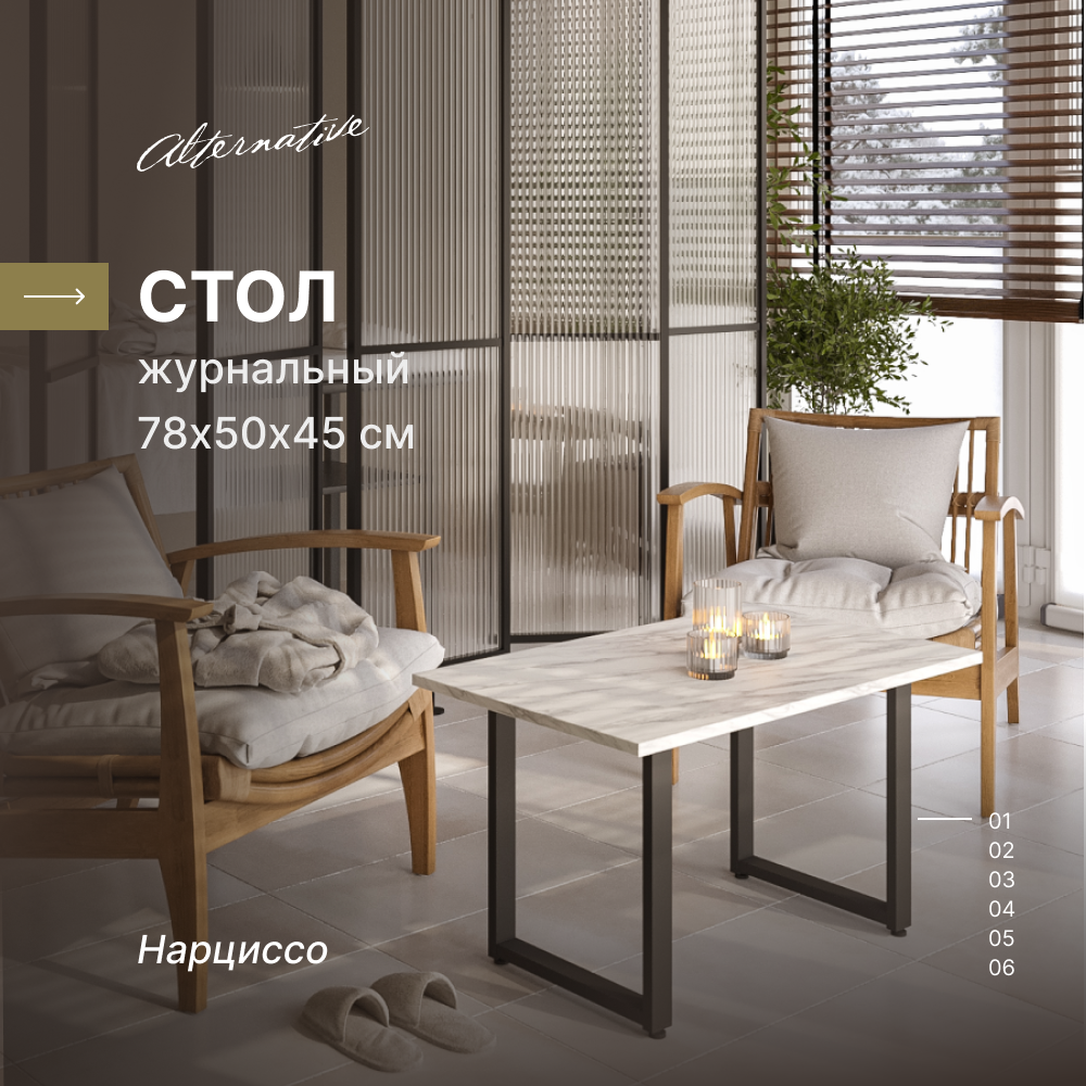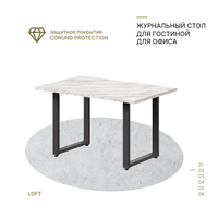 Дизайн журнального стола выполнен на стыке нескольких направлений: лофт, классика и минимализм. Прямолинейность форм и устойчивость конструкции в совокупности с толстой столешницей, которая имитирует слэб натурального древа или камня, подарят своему обладателю комфорт, качество, чувство надежности.
