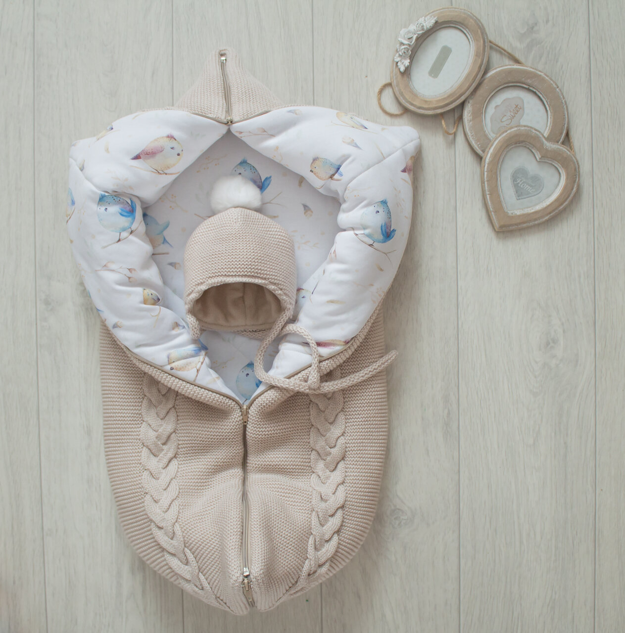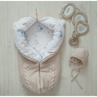 Стильное вязаное одеяло-трансформер с косами. Верх выполнен из мягкой пряжи оттенка латте, подклад из нежного хлопка: интерлок. Большое и уютное - малышу в нем будет тепло и комфортно. Его можно трансоформировать различными способами: одеялом, конвертом, коконом. Одеяло подойдет для выписки и прогулок на свежем воздухе. Можно использовать вплоть до 9 месяцев.