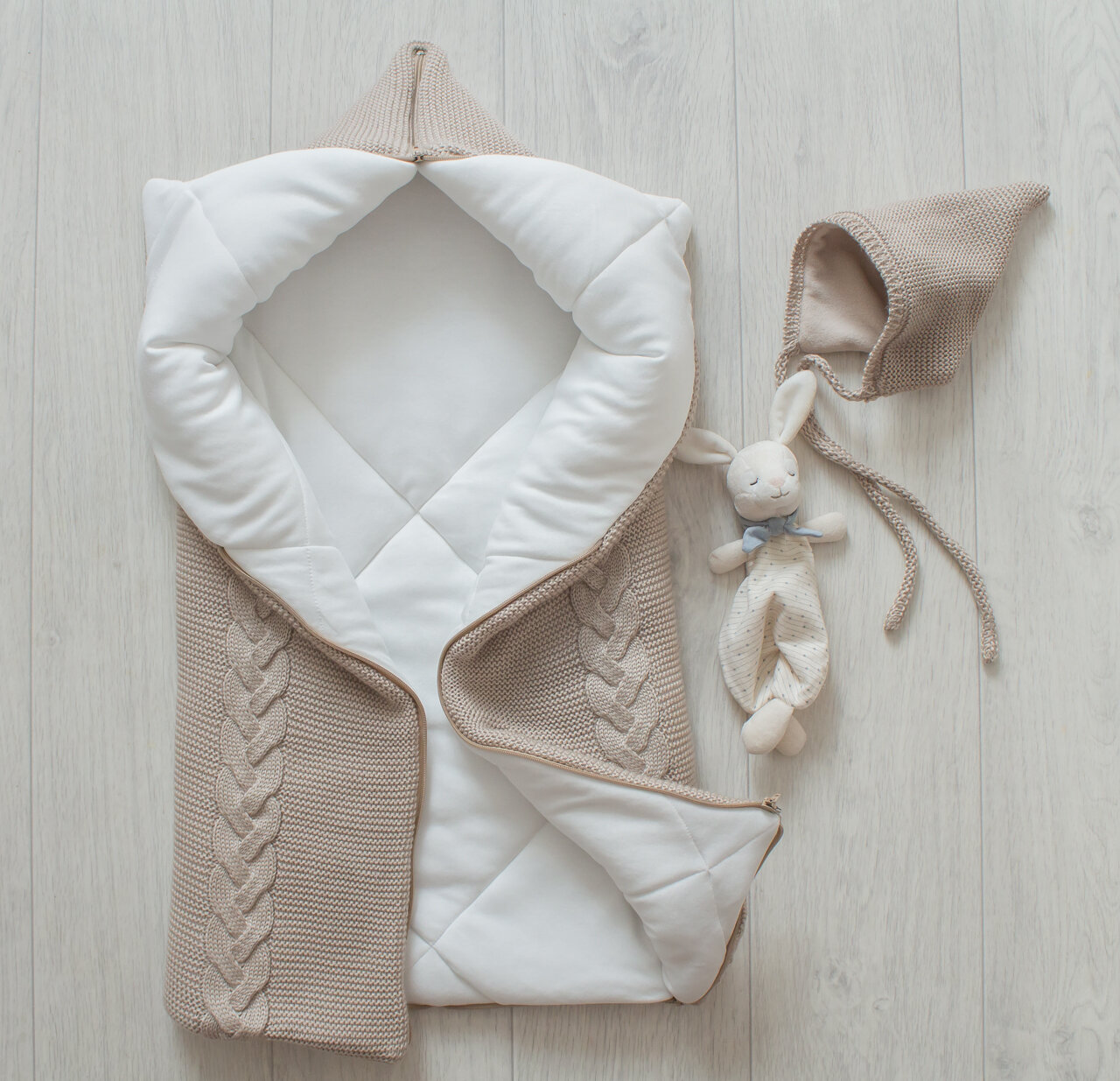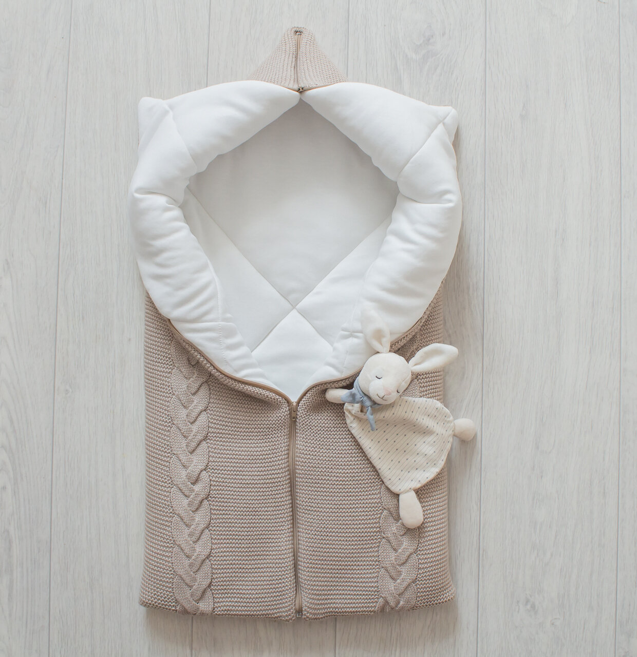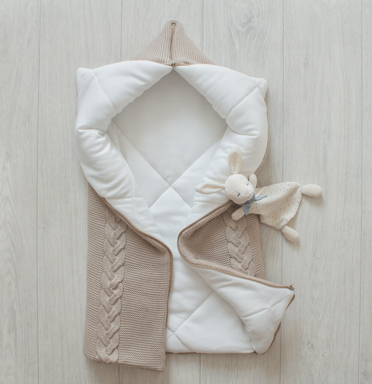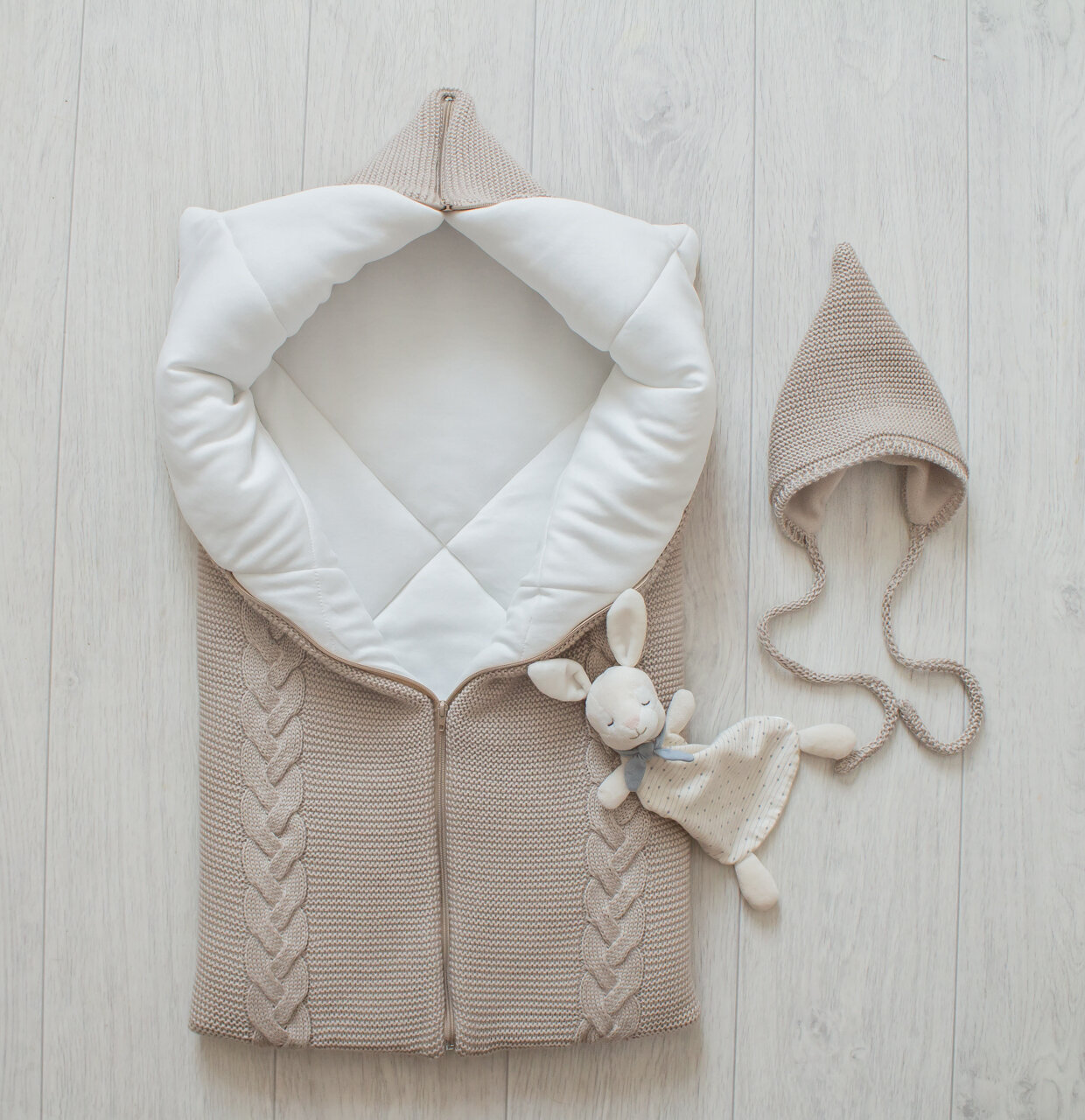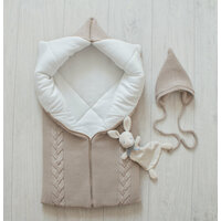 Теплое, вязаное одеяло-трансформер с косами. Верх выполнен из мягкой, приятной на ощупь пряжи, подклад из однотонного, нежного хлопка- интерлок. Большое и уютное - малышу в нем будет тепло и комфортно. Одеяло легко трансформируется в 3 варианта: одеяло, конверт, кокон. Отлично подойдет для выписки и прогулок на свежем воздухе в первые месяцы жизни ребенка. Можно использовать вплоть до 9 месяцев.