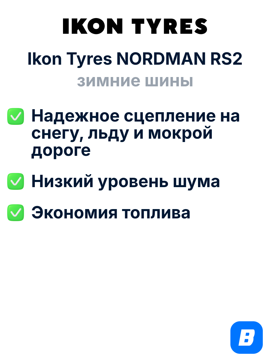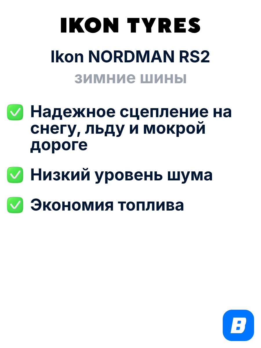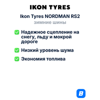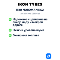 Ikon Tyres Nordman RS2 - это фрикционные зимние шины, разработанные для уверенного вождения в суровых зимних условиях. Они обеспечивают сбалансированное сочетание комфорта, безопасности и экономичности. Монолитное центральное ребро жесткости обеспечивает курсовую устойчивость, а широкие плечевые блоки - точность прохождения поворотов и тягово-сцепные характеристики на мягких покрытиях.