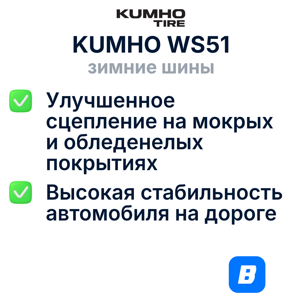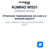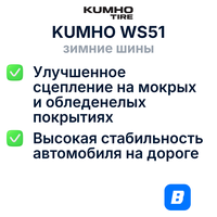 KUMHO WS51 — эта модель адаптирована для эксплуатации как на асфальтированных дорогах, так и в сложных зимних условиях, обеспечивая надежность и безопасность. По сравнению с предыдущими моделями, WS51 демонстрирует значительно лучшие сцепные характеристики на мокром и обледенелом покрытии, что особенно важно для зимних поездок. Беговая часть протектора была полностью переработана. Уменьшенная ширина центрального ребра позволила увеличить количество блоков, что в свою очередь повысило количество продольных кромок. Это улучшает курсовую устойчивость и точность управления.
