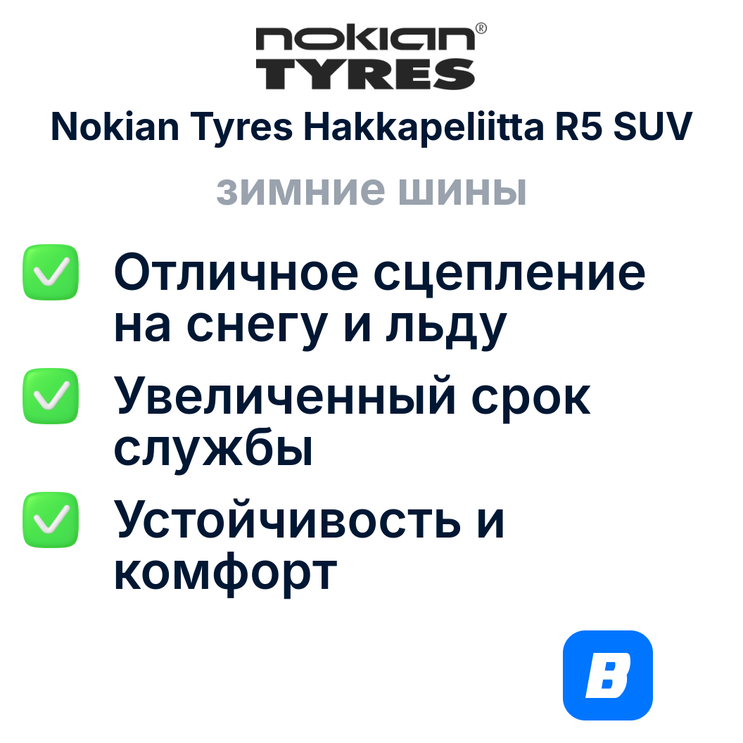 Nokian Tyres Hakkapeliitta R5 SUV — премиальные нешипованные зимние шины, специально разработанные для кроссоверов и внедорожников, которые требуют надежности и устойчивости в сложных зимних условиях. Эти шины обеспечивают отличное сцепление, высокую износостойкость и комфортное вождение, идеально подходя для мощных и крупногабаритных автомобилей. Зимний индикатор износа (WSI) визуально отображает глубину протектора, позволяя своевременно заменять шины для поддержания высокого уровня безопасности. Все шины Hakkapeliitta R5 имеют евро-маркировку, подтверждающую их эффективность в сложных зимних условиях.