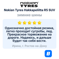 - Устойчивость и комфорт: Hakkapeliitta R5 SUV гарантирует максимальную устойчивость на дороге и комфортное вождение даже при повышенных нагрузках. Арамидные волокна в боковинах шины обеспечивают дополнительную прочность и защиту от проколов.