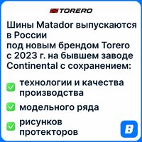 Шины Matador выпускаются в России под новым брендом Torero с 2023 года на бывшем заводе Continental с сохранением технологий, модельного ряда и протекторных рисунков.