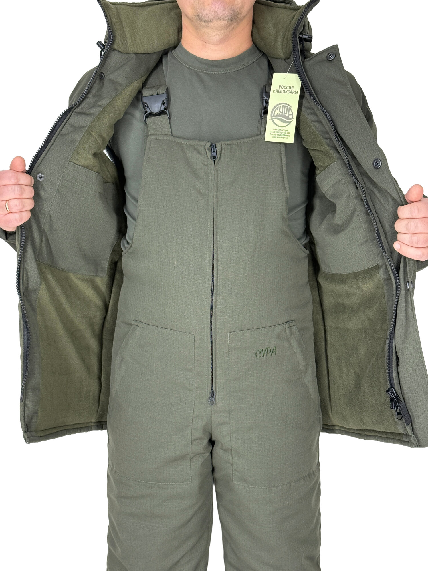 Купить Зимний камуфлированный костюм с полукомбинезоном зимаф на флисе , синтепоне с подкладом из термофольги для рыбалки , работы и туризма с доставкой по всей России.