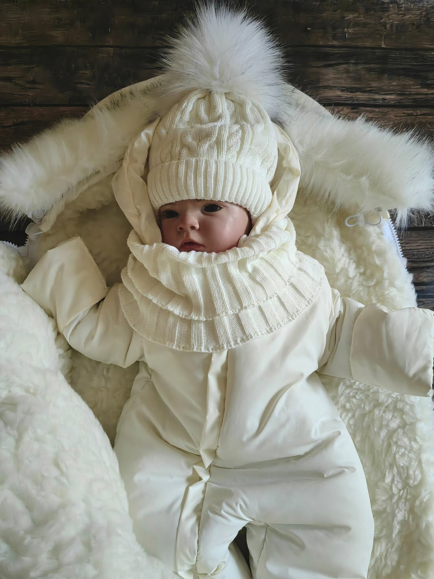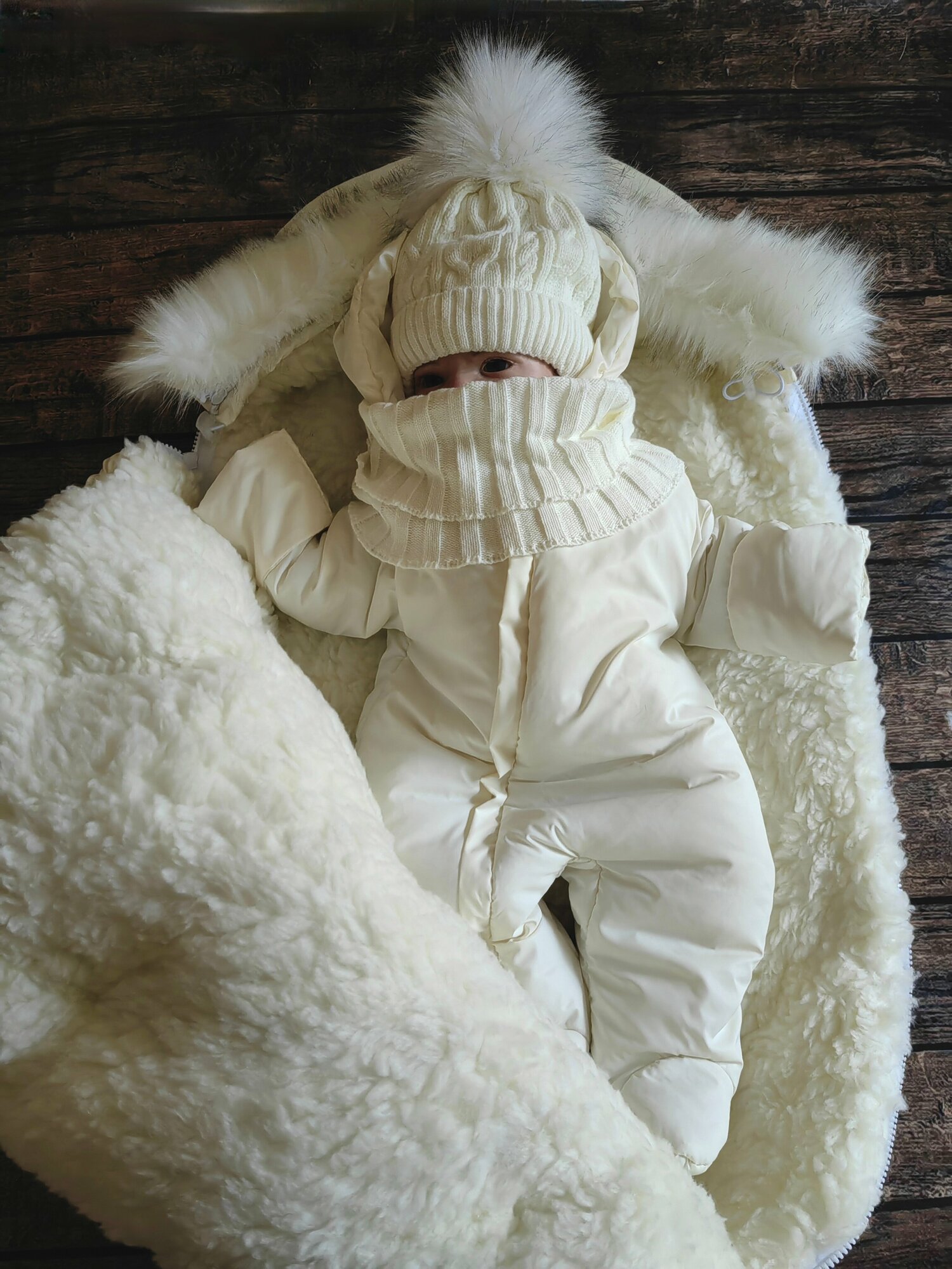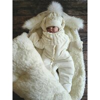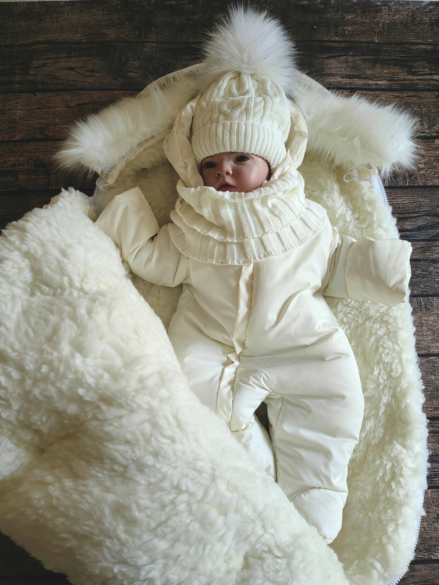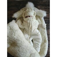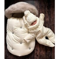 Зимний конверт премиум класса. Если вы ищите конверт на выписку для девочки который будет смотреться дорого то эта модель именно для ВАС. В комплекте нет ничего лишнего, конверт на выписку из роддома отшит из премиум материалов. Зимний комплект на выписку новорожденного из роддома включает четыре предмета для малыша: меховой конверт в коляску или конверт на выписку утепленный, комбинезон 68 размера, теплая шапочка и мягкий снуд. Очень теплый зимний конверт для девочки до -35 градусов очень хорошо закрывает голову и плечи, если затянуть капюшон легкий, не сковывает движения малыша, верхняя часть полностью отстегивается, прост в уходе, допустима машинная стирка. Прогулочный конверт имеет внутреннюю подкладку из овечьей шерсти, утеплен термофином. Опушка из искусственного, идентично натуральному меха(исключает аллергию, как это часто бывает с натуратльным мехом), отстегивает. Отвороты на рукавах открывают или закрывают ручки ребенка в зависимости от погоды и заменяют варежки. Конверт подходит как вкладыш в коляску для прогулок с ребенком зимой. Если использовать изделия по отдельности, то подходит на осень-весну от 5 до -0 градусов, при совместной носке - на холодную зиму до -35 градусов. Материал верха имеет водоотталкивающую пропитку, с которой скатываются капли воды и мокрый снег.