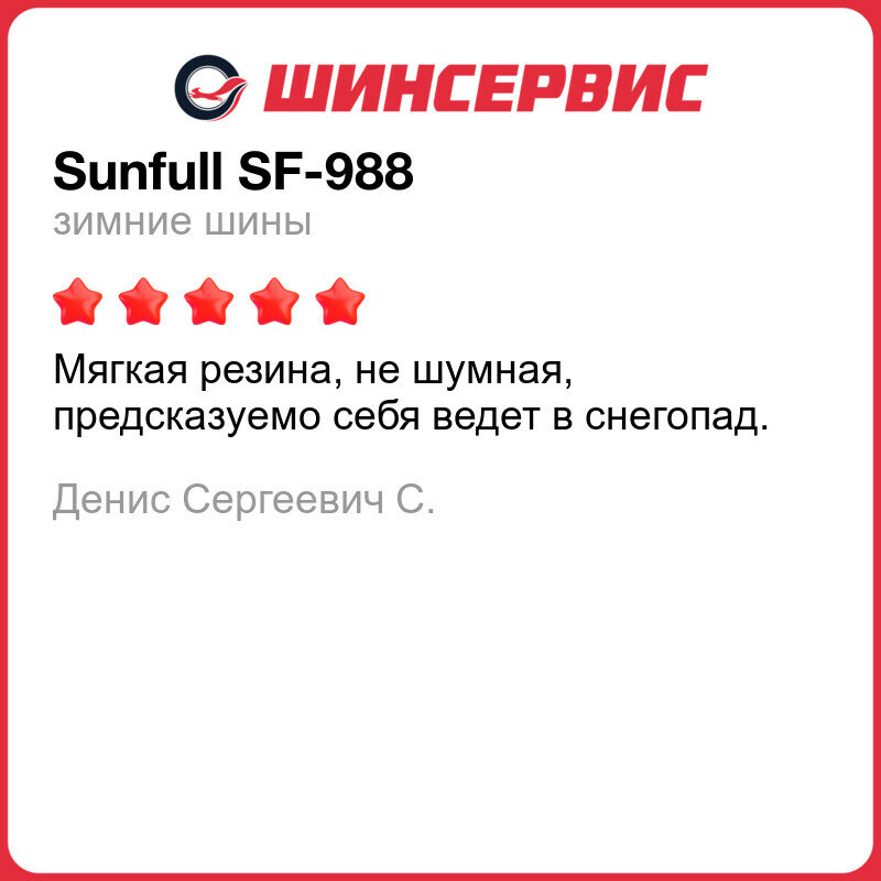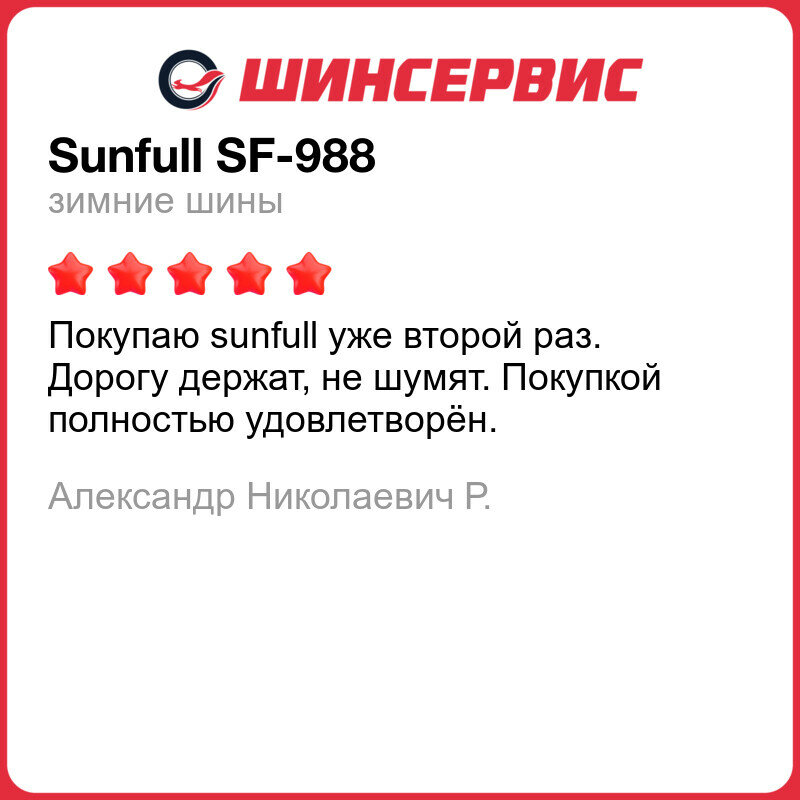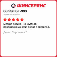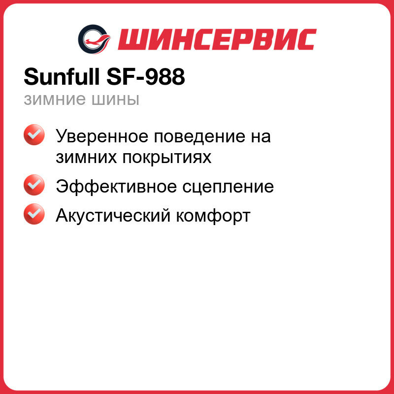 Sunfull SF-988 - зимние шины для легковых автомобилей с нешипованным асимметричным протектором. Обеспечивают уверенное поведение на зимних покрытиях, за счет эффективного сцепления и высоких тяговых характеристик. Специальные канавки в протекторе помогают эффективно отводить воду из пятна контакта, снижая риск аквапланирования. Переплетение ламелей создает дополнительные грани сцепления, улучшая тормозные характеристики и управляемость.