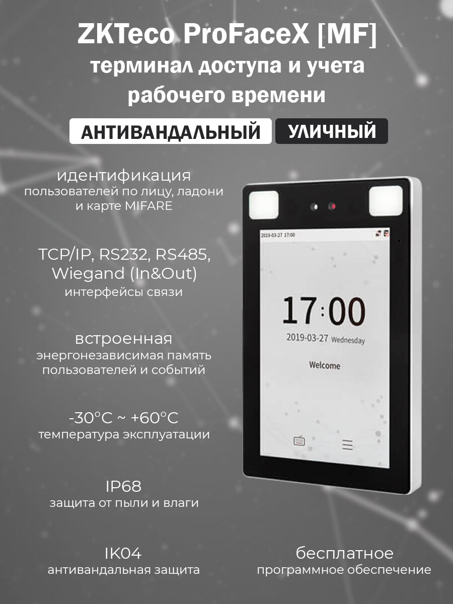 ZKTeco ProFaceX [MF] уличный биометрический терминал распознавания лиц и ладоней со считывателем карт Mifare: сравнение цен, характеристики, фото, актуальное наличие и цены.