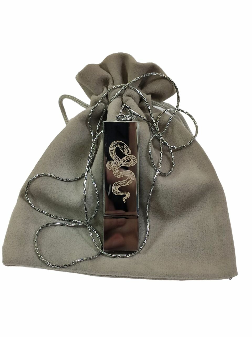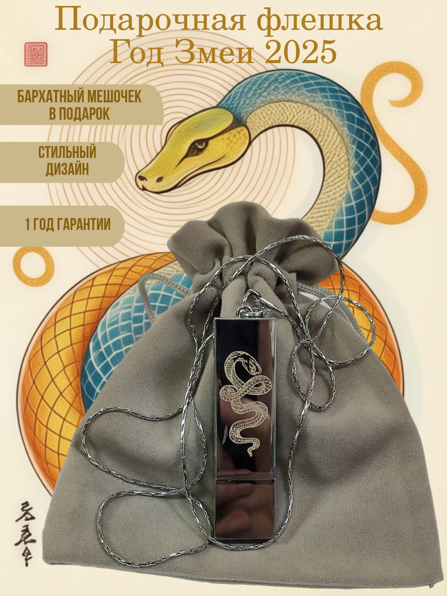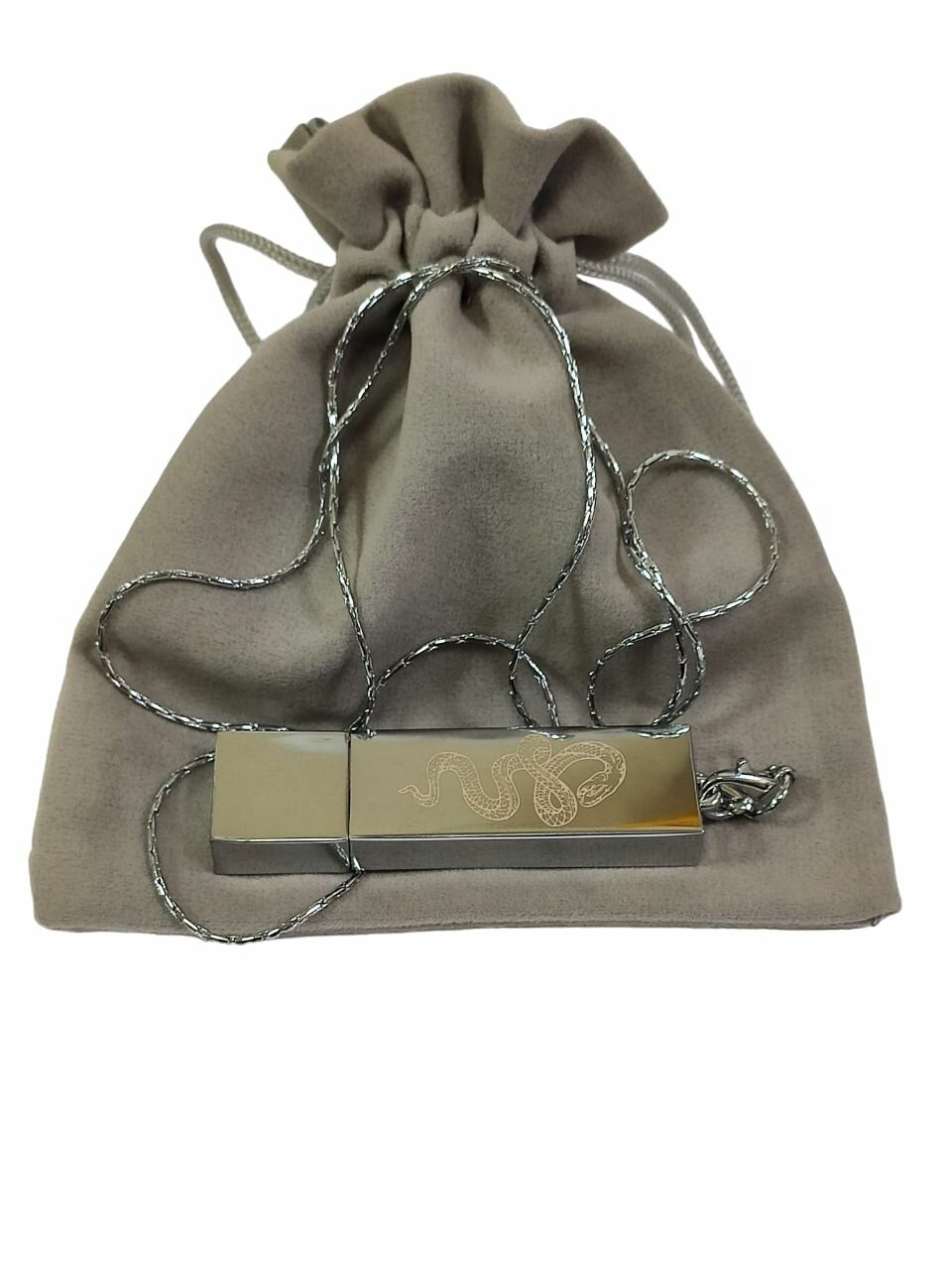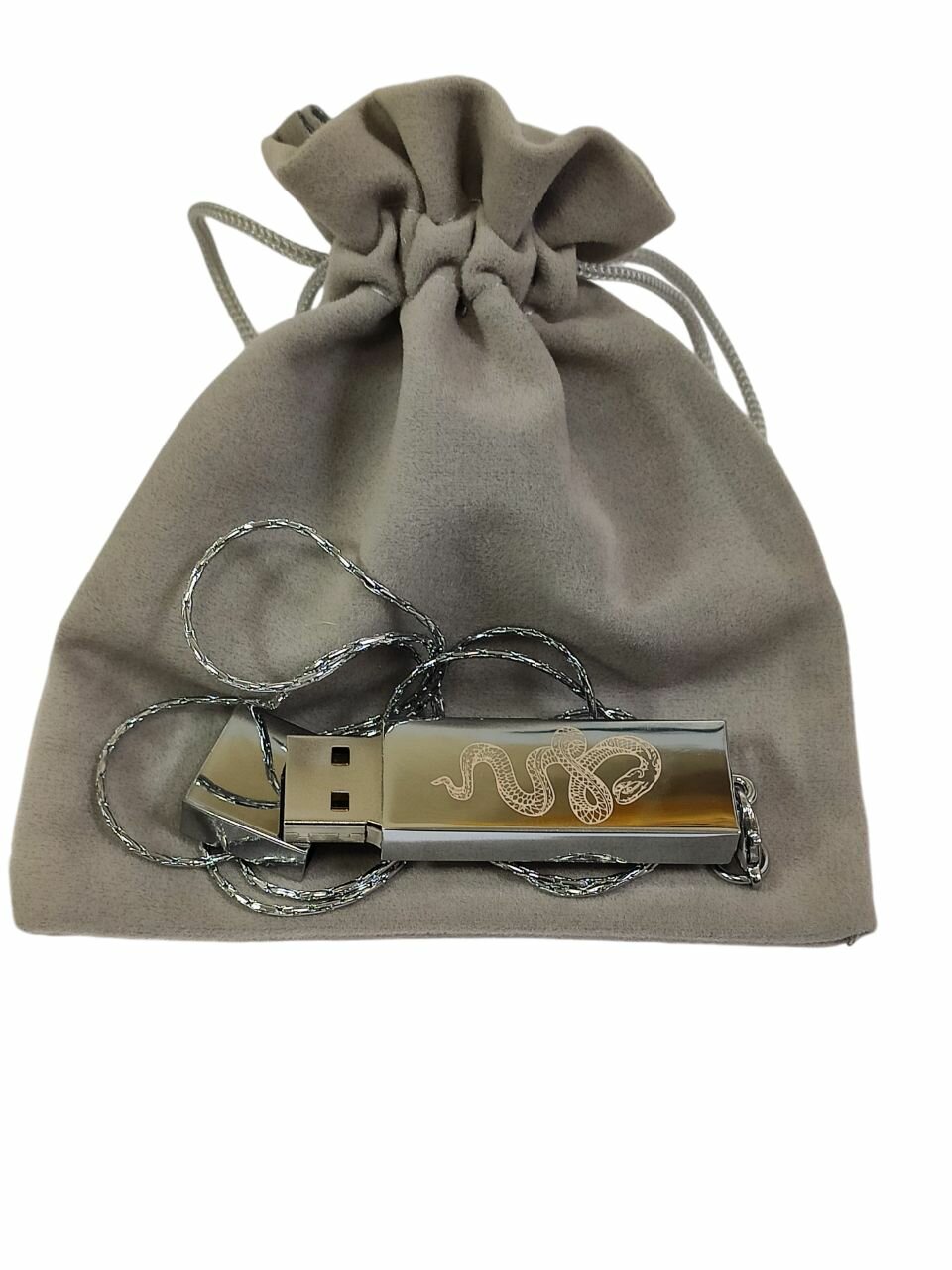 Флешка выполнена из металла, что гарантирует ее долговечность и надежность. Серебристый цвет корпуса придает ей элегантный вид, а гравировка в виде змеи добавляет уникальности.