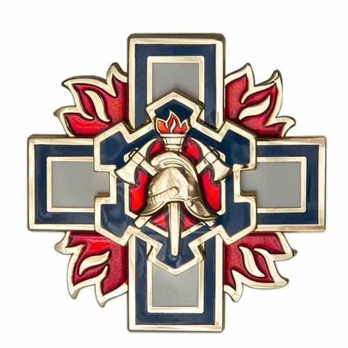 Нагрудный знак "Специальные подразделения ФПС" выполнен в форме креста с яркими эмалевыми элементами и символикой пожарной охраны. Изделие предназначено для памятного вручения и формирования коллекций. В центре знака размещена рельефная композиция, включающая традиционные символы - пожарный шлем и перекрещенные топоры. Факел с пламенем подчеркивает значимость пожарно-спасательной службы и ее роль в обеспечении безопасности населения. Основание выполнено в виде равностороннего креста, покрытого синей и белой эмалью, за которым расположены стилизованные языки пламени красного цвета. Крепление винтового типа. К знаку прилагается чистый бланк удостоверения без подписей и печатей. Типографская биговка позволяет аккуратно сложить бланк пополам. Удостоверение к медали обернуто пленкой и слоем картона, что обеспечивает сохранность внешнего вида. Изделие упаковывается в плотный картон и водонепроницаемый zip-пакет.