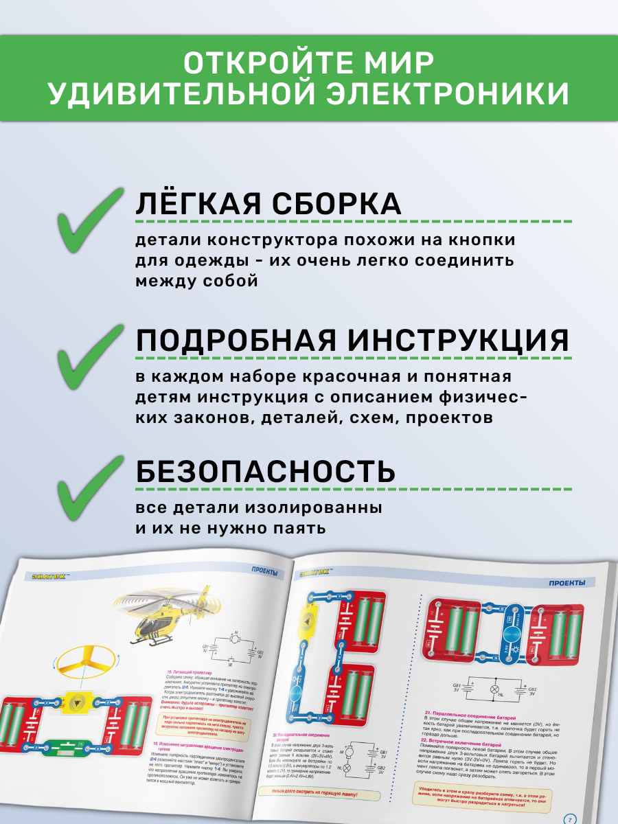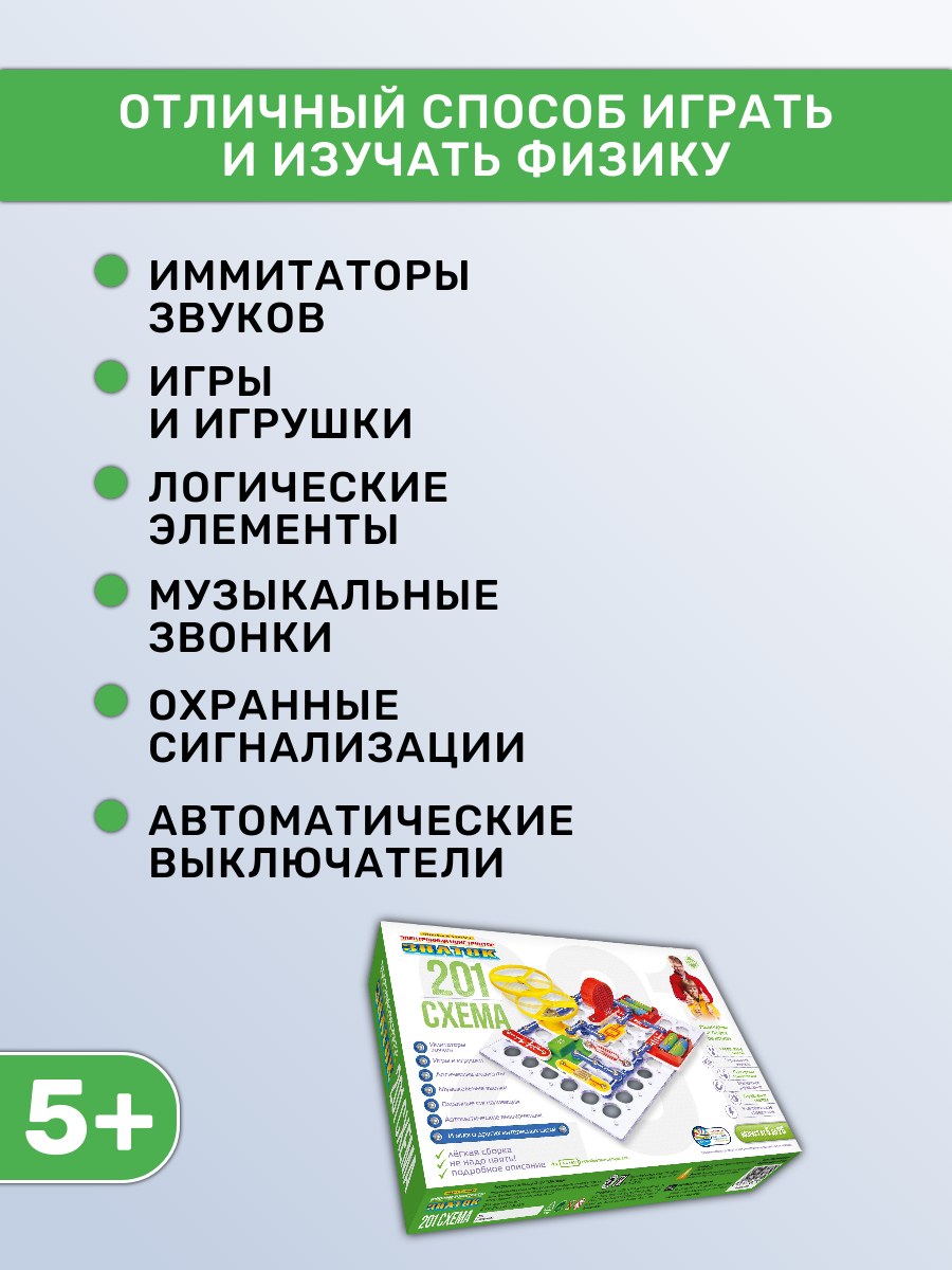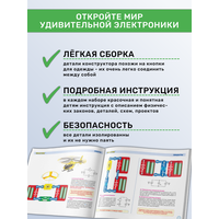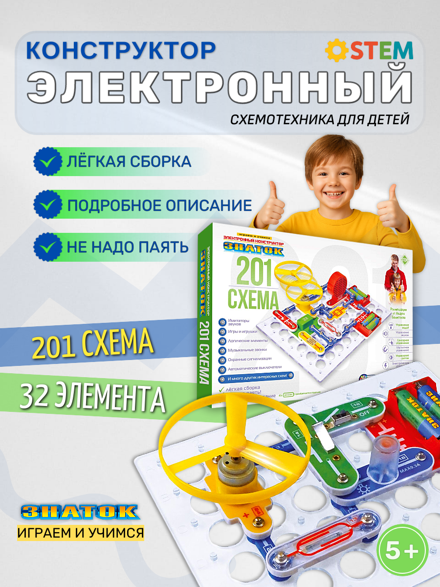 Детский электронный конструктор знаток 201 схема начального уровня позволяет ребёнку познакомиться с удивительным миром электроники! Летающий пропеллер, лампа, светодиодные фонарики, охранные сигнализации, музыкальные звонки – все это и многое другое ребенок сможет собрать самостоятельно! Управляем при помощи воды, звука, света, магнита. Изучаем логические элементы, интегральные схемы, сенсорное управление, электрическое управление, фоторезистор. Это лучший обучающий инструмент для изучения схемотехники специально разработанный для детей, основанный на многолетнем опыте экспертов по электронике! Схемы имеют наглядный и принципиальный вид. Отличный подарок для мальчиков и девочек в возрасте от 5 до 16 лет. Яркое и понятное руководство поможет вам, всего за несколько минут, собрать и испытать схему! Ваш ребёнок научится собирать электрические схемы и выполнять задания к ним. Абсолютная безопасность и простота сборки - не надо паять! Удовольствие получают не только дети, но и их родители! Подарок, подарок девочке, подарок мальчику, подарки детям, подарок на новый год, подарок на день рождения, конструктор обучающий, конструктор развивающий, конструктор электронный, конструктор для детей, конструктор знаток, детский конструктор.