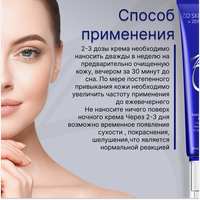 | Способ применения | 2-3 дозы крема необходимо наносить дважды в неделю на предварительно очищенную кожу вечером за 30 минут до сна. По мере постепенного привыкания кожи необходимо увеличить частоту применения до ежевечернего. Не наносите ничего поверх Интенсивного обновляющего ночного крема. Через 2-3 дня возможно появление сухости, покраснения, шелушения, что является нормальной реакцией. |