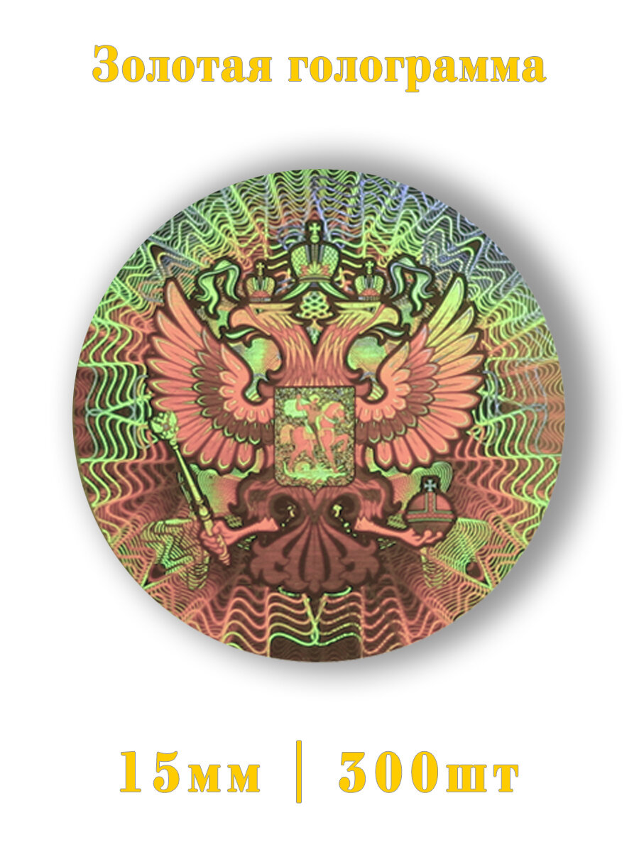 Голограмма это наклейка которая наносится на документы или продукцию. Наклейки с голографическим фоном или изображением и прозрачный ламинат эффективные средства защиты документов и товаров от подделки и оригинальный маркетинговый ход. Голографический ламинат сделан из полимерных материалов. Голографическая наклейка имеет особенный дизайн и форму. Голографическая марка используется для защиты таких важных документов как паспорт, удостоверение, пропуск. Голограммы на справки и мед книжки используются в мед. учреждениях. Купить галограммы защитные можно для повышения имиджа продукции. Использование голографических этикеток на товарах придает им необычный дизайн. Стандартные голограммы можно использовать на упаковке, чтобы предотвратить преждевременное вскрытие. Голограмма Герб РФ имеет диаметр 15 мм, цвет золото.