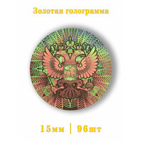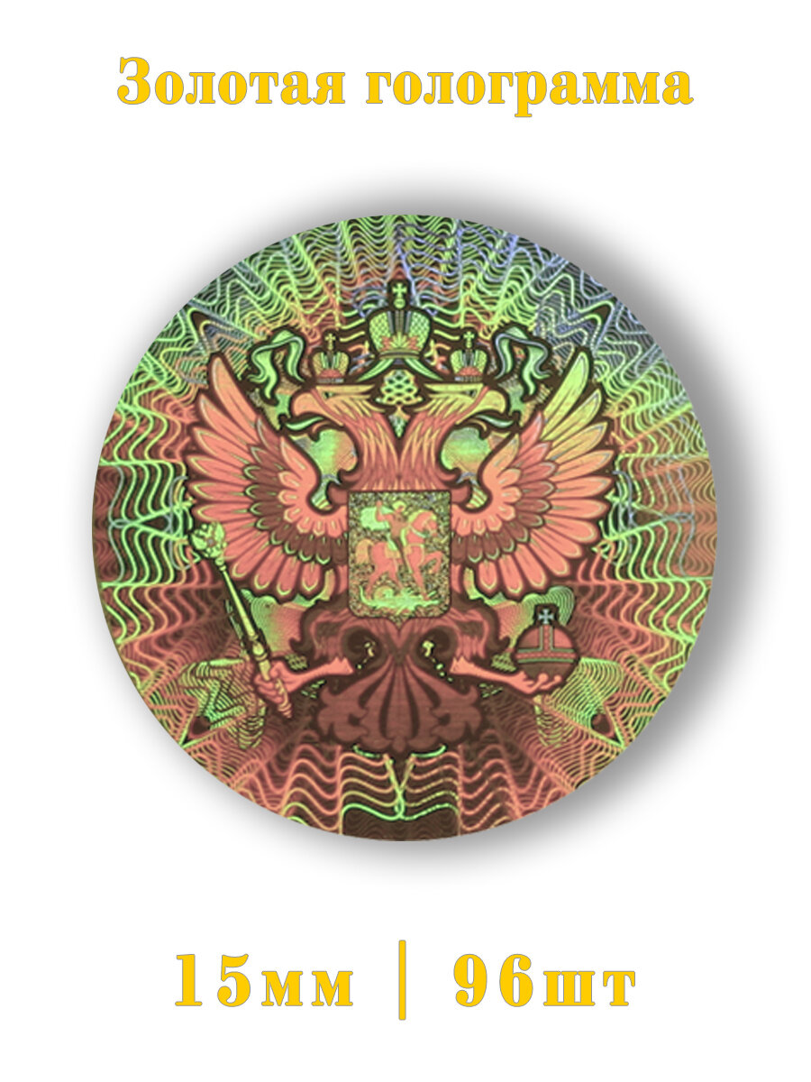 Голограмма это наклейка которая наносится на документы или продукцию. Наклейки с голографическим фоном или изображением и прозрачный ламинат эффективные средства защиты документов и товаров от подделки и оригинальный маркетинговый ход. Голографический ламинат сделан из полимерных материалов. Голографическая наклейка имеет особенный дизайн и форму. Голографическая марка используется для защиты таких важных документов как паспорт, удостоверение, пропуск. Голограммы на справки и мед книжки используются в мед. учреждениях. Купить галограммы защитные можно для повышения имиджа продукции. Использование голографических этикеток на товарах придает им необычный дизайн. Стандартные голограммы можно использовать на упаковке, чтобы предотвратить преждевременное вскрытие. Голограмма Герб РФ имеет диаметр 15 мм, цвет золото.