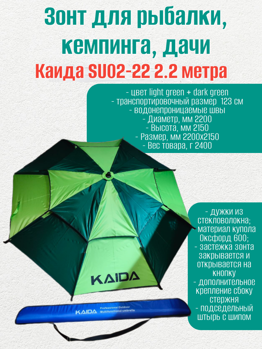 Купить Зонт для рыбалки, кемпинга, дачи Каида SU02-22 2.2 метра Green с доставкой по всей России. Зонт для рыбалки, кемпинга, дачи Каида SU02-22 2.2 метра Green: сравнение цен, характеристики, фото, актуальное наличие и цены.