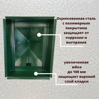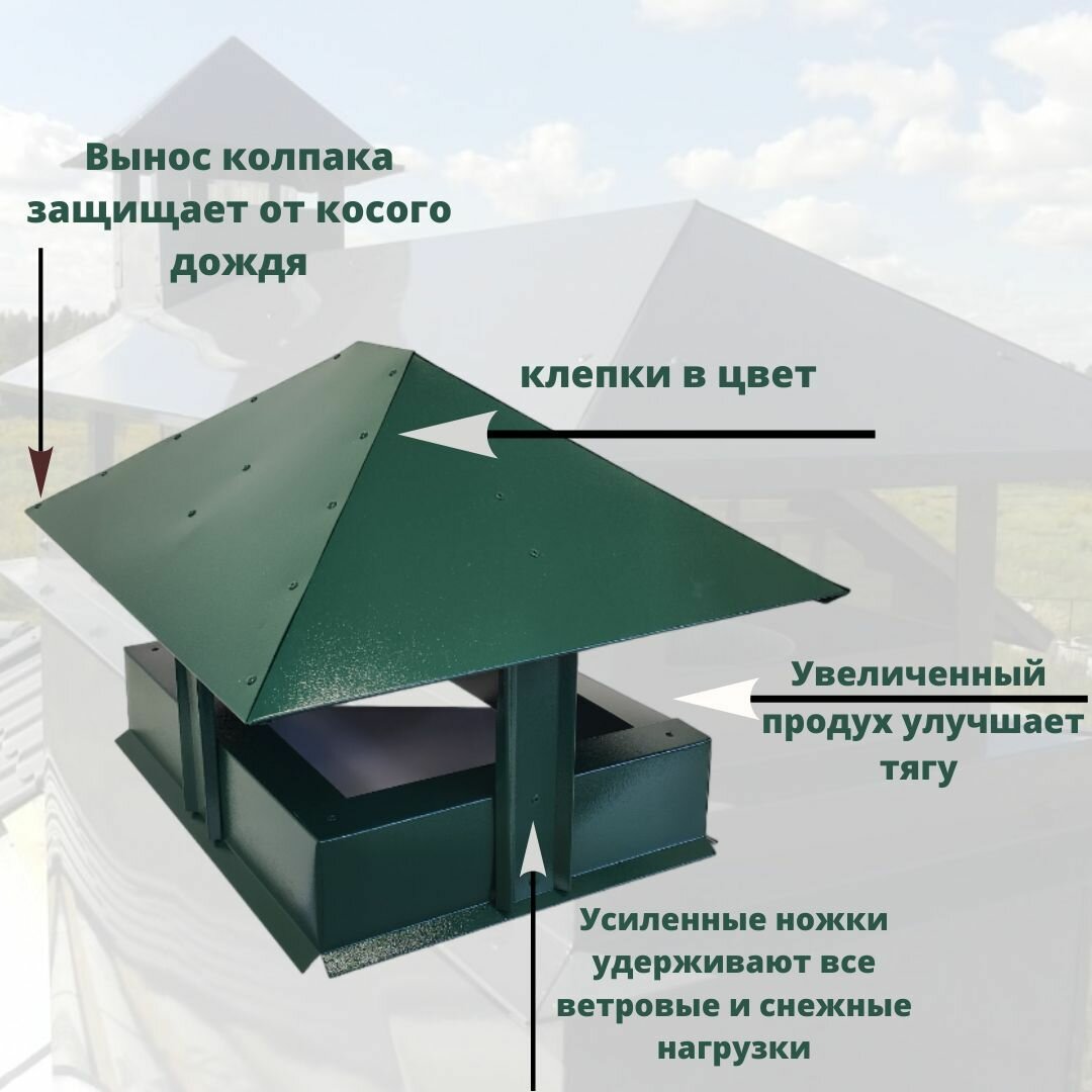 У данного колпака на трубу дымохода есть несколько преимуществ. Увеличенная юбка до 100 мм защищает верхний слой кладки от разрушения, а усиленные ножки удерживают все ветровые и снежные нагрузки. Увеличенный продух улучшает тягу, а вынос колпака защищает от косого дождя.