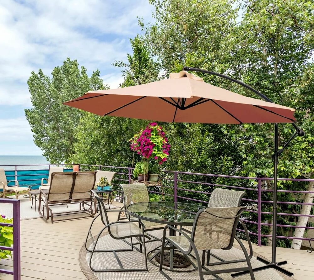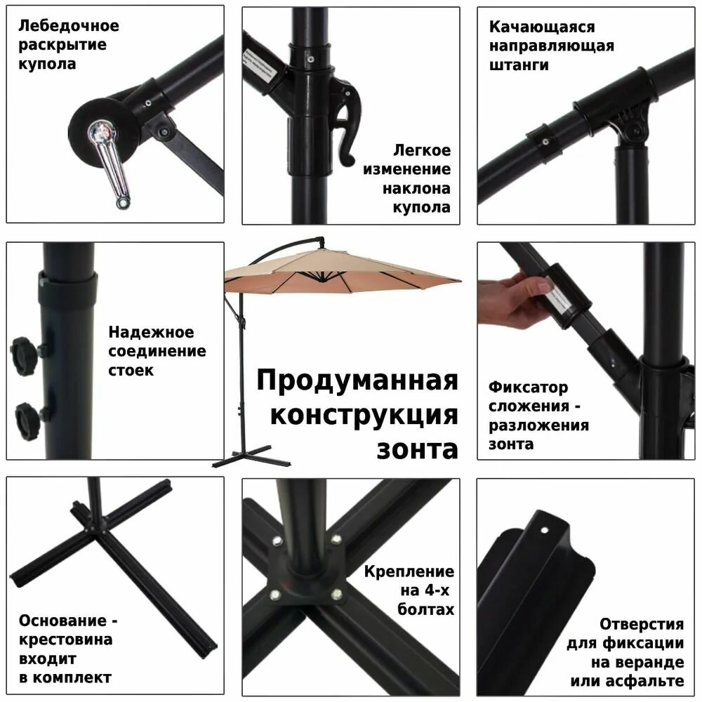 Большой зонт Green Glade – незаменим для отдыха на даче, загородном участке и около бассейна. Он защитит вас и ваших детей от яркого солнца и создаст комфортную тень. Купол зонта легко открывается с помощью лебедки. Благодаря центральному расположению стойки под куполом по сторонам можно установить любую пластиковую мебель: от шезлонга до обеденного стола.