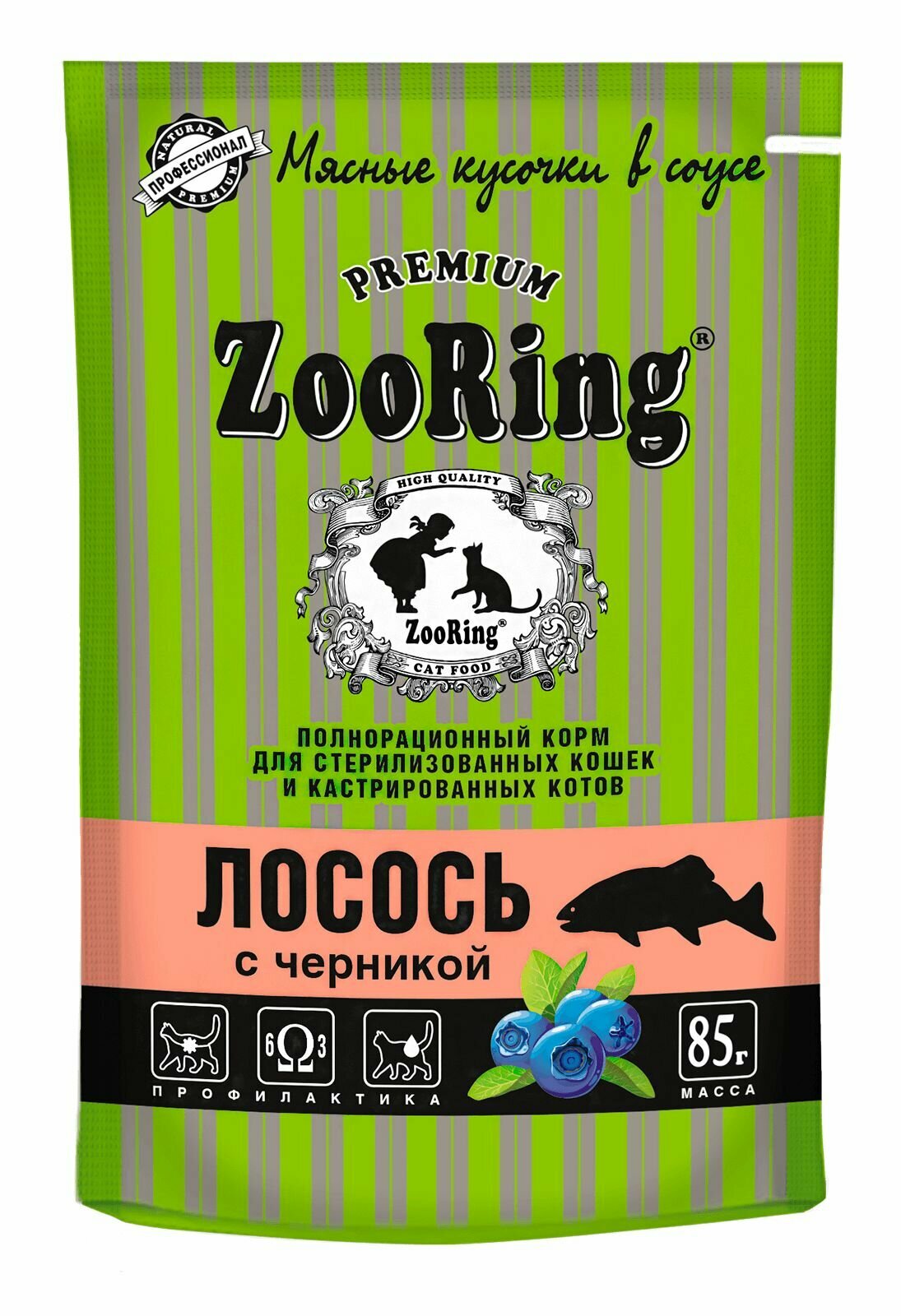 Купить Zooring Лосось с черникой для кастрированных котов и стерилизованных кошек сочные кусочки в соусе, паучи, 26 шт х 85 гр с доставкой по всей России.