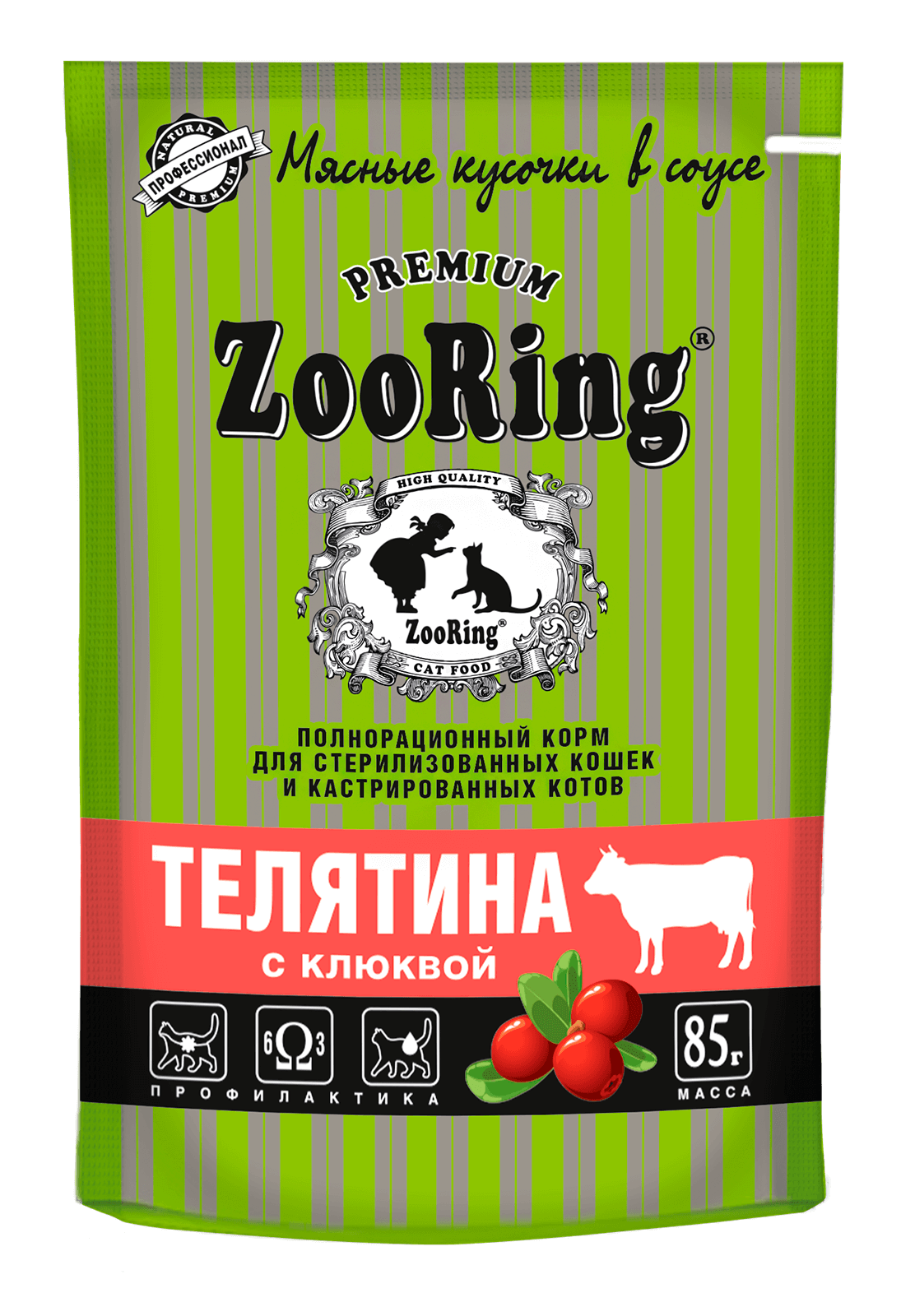Zooring Телятина с клюквой для кастрированных котов и стерилизованных кошек сочные кусочки в соусе, паучи, 26 шт х 85 гр: сравнение цен, характеристики, фото, актуальное наличие и цены.