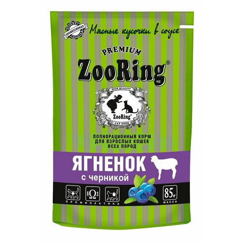 Полнорационный консервированный влажный корм ZooRing кусочки в соусе для взрослых кошек всех пород с ягненком и черникой.