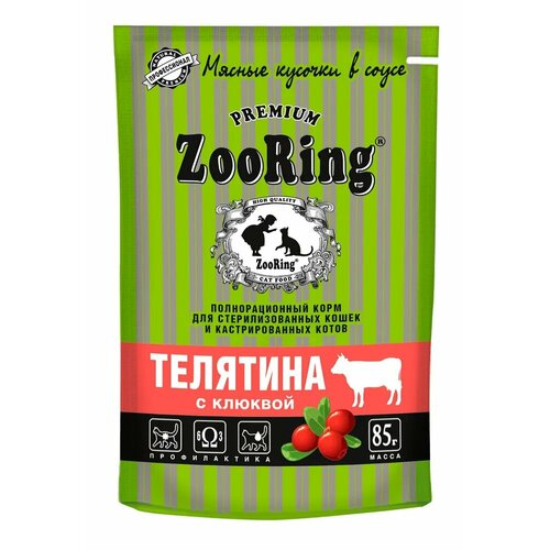 Полнорационный консервированный влажный корм ZooRing кусочки в соусе для взрослых кастрированный котов и стерилизованных кошек с телятиной и клюквой.
