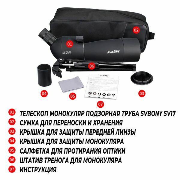 Зрительная труба SVBONY SV28 25-75×70 + тренога и сумка (для бёрдвотчинга, охоты, стрельбы, пейзажа): сравнение цен, характеристики, фото, актуальное наличие и цены.
